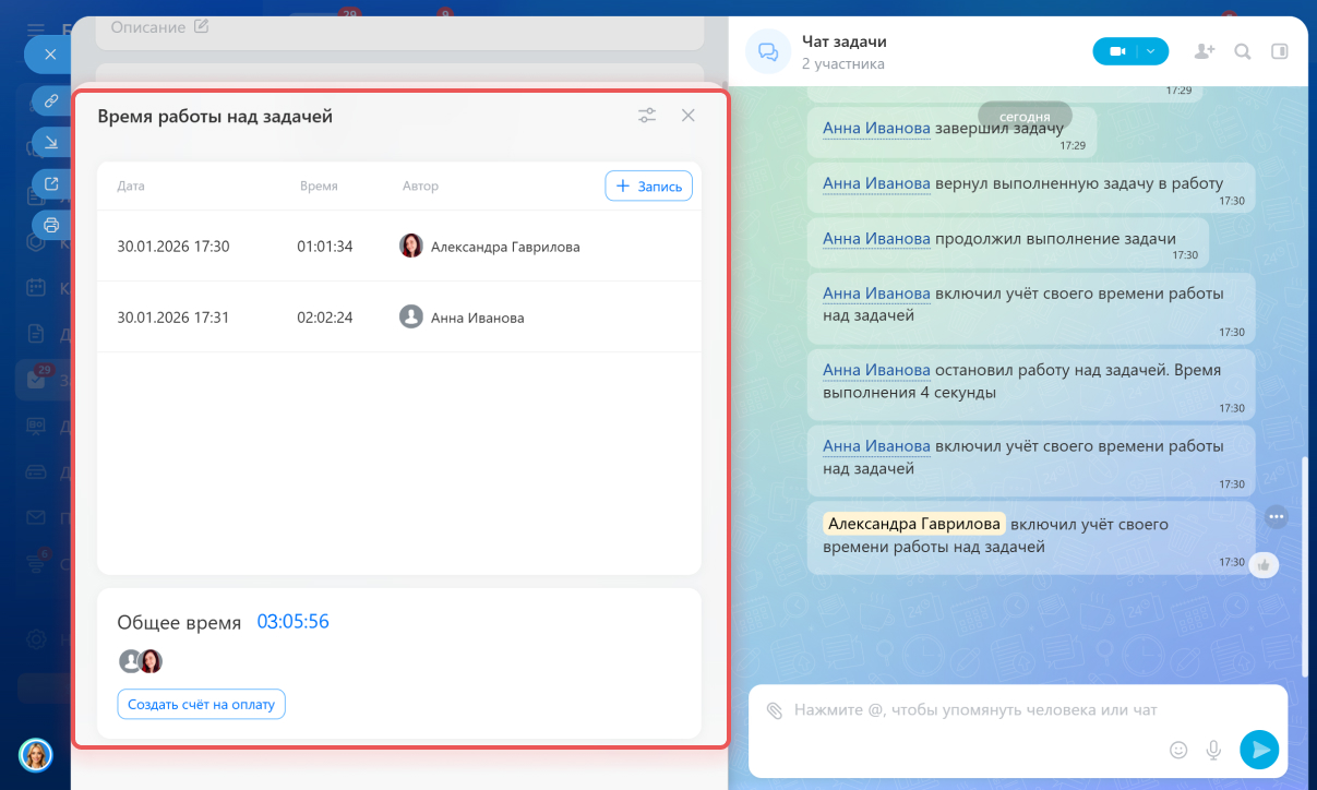 Если в задаче несколько участников, они могут вести учет времени одновременно. Фактически затраченное время суммируется, поэтому можно увидеть, сколько времени на задачу потратила вся команда.