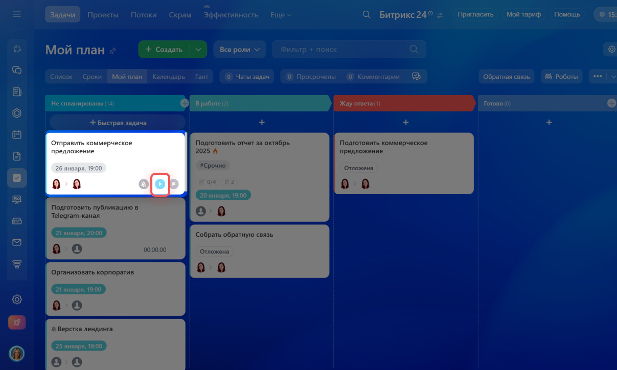 Из списка задач. Запустить и приостановить учет времени можно в режимах просмотра Сроки, Список и Мой план. Наведите курсор на карточку и нажмите