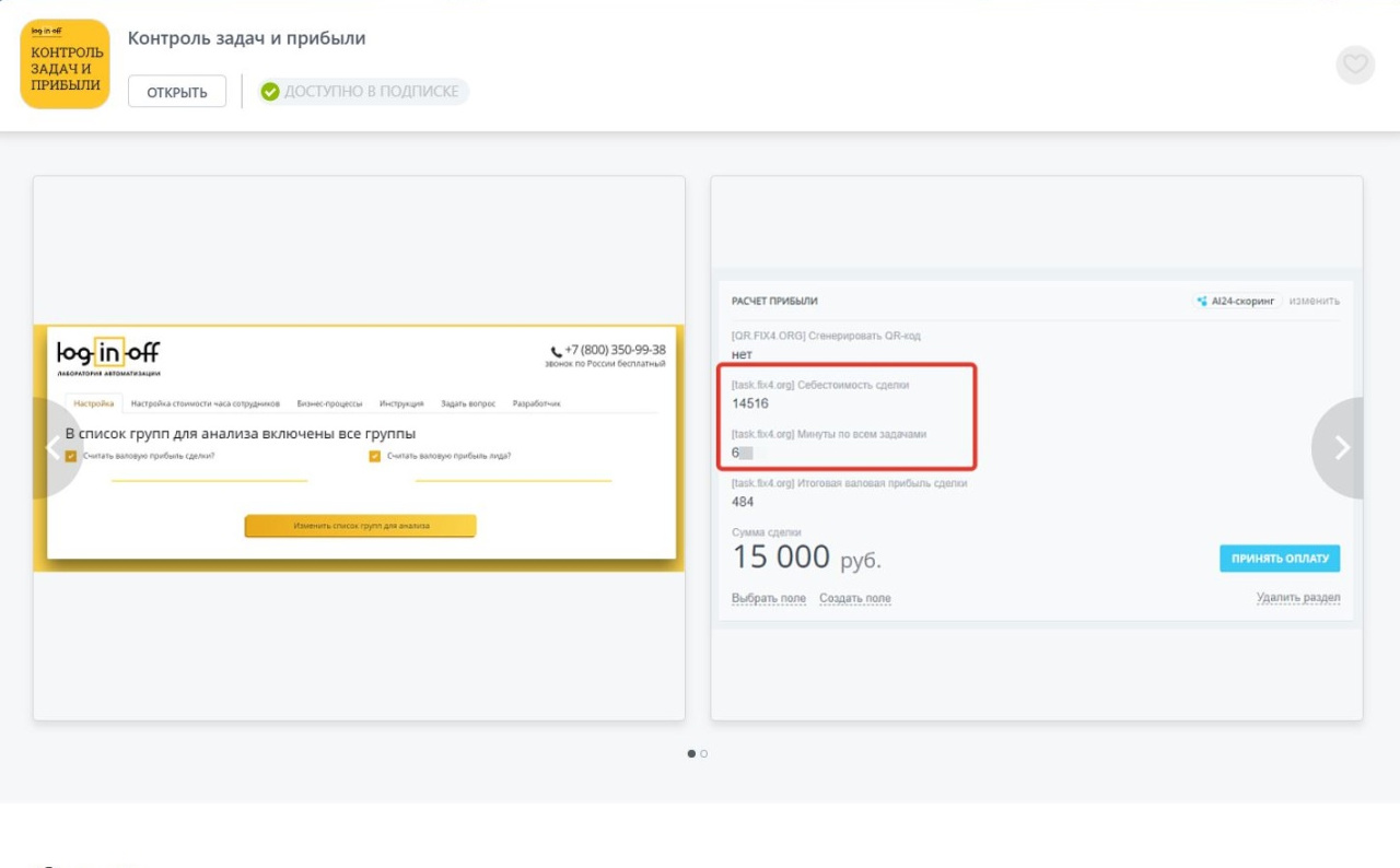 Приложение собирает данные по всем задачам Сделки, умножает время на ставку сотрудника, суммирует затраты, вычитает из оплаты клиента, выводит валовую прибыль.