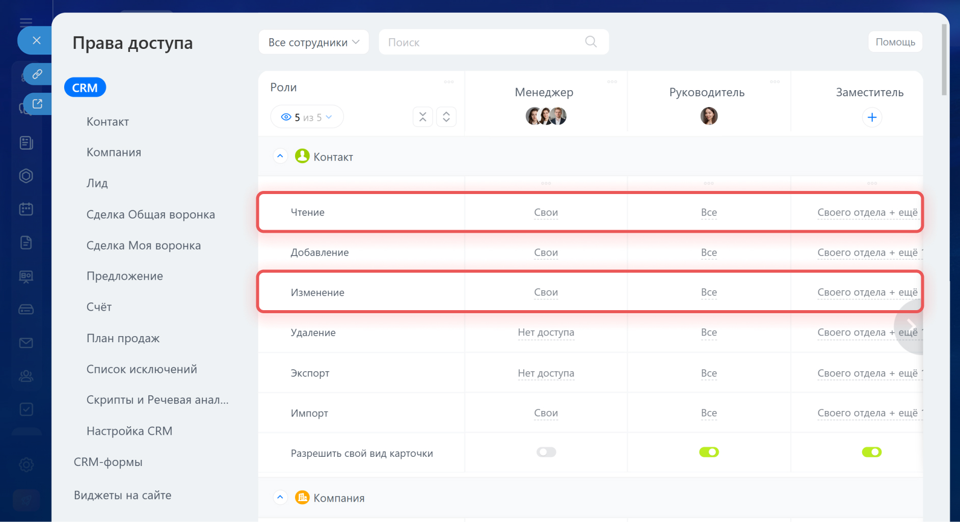Сценарий: менеджер работает только со своими делами, а руководитель — с делами всех сотрудников. Можно настроить стандартные роли или создать свои.