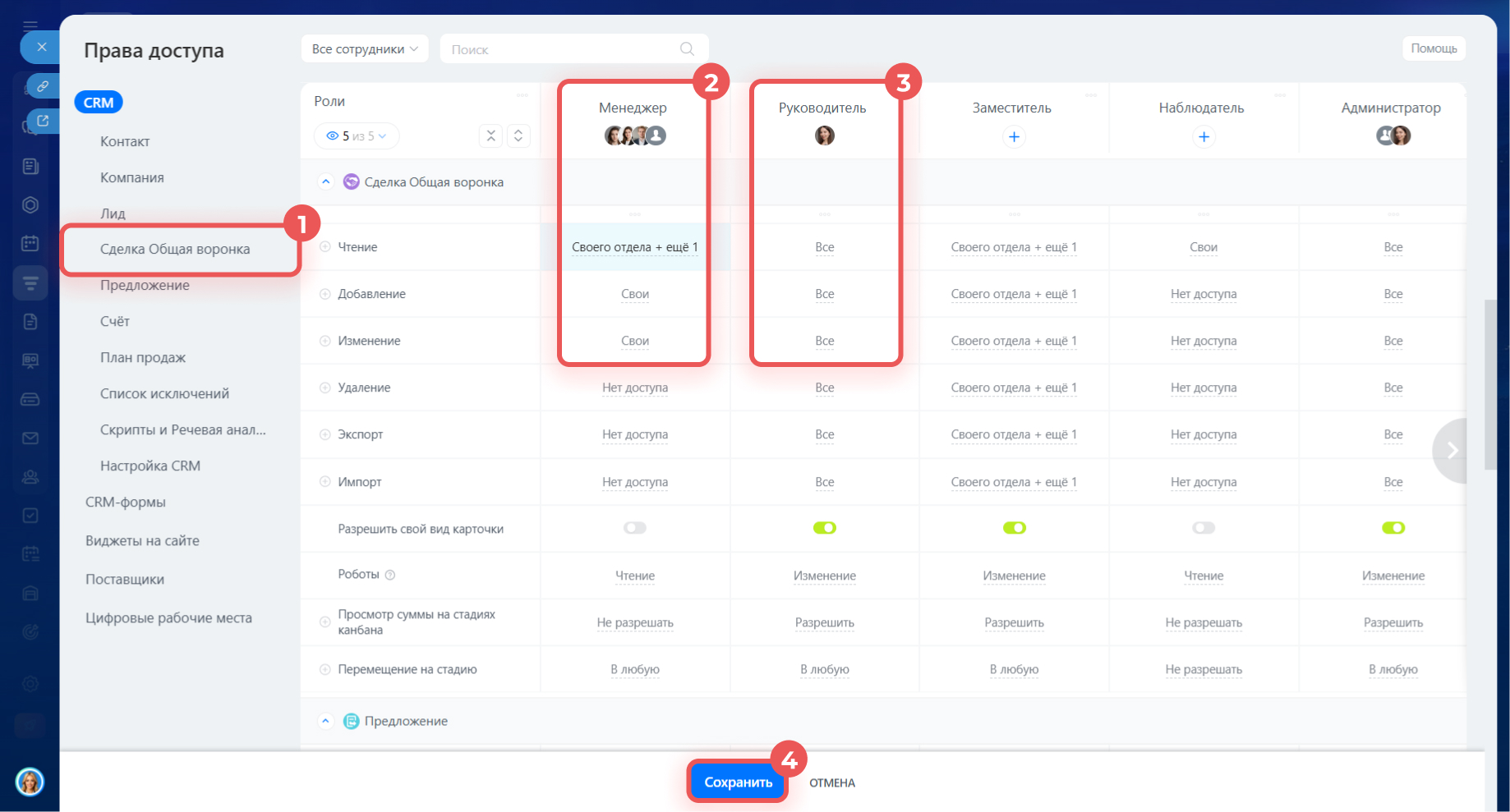 Ролевая модель прав в CRM доступна не на всех тарифах.
