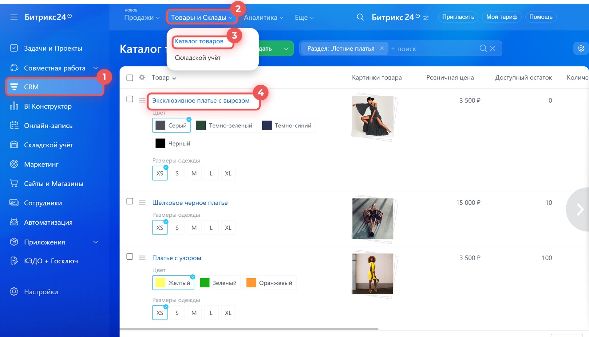 1–4. Перейдите в раздел CRM > Товары и склады > Каталог товаров и откройте нужный товар.