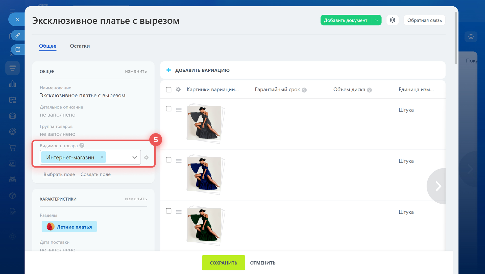 5. В карточке товара найдите поле Видимость товара и отключите значение Интернет‑магазин.