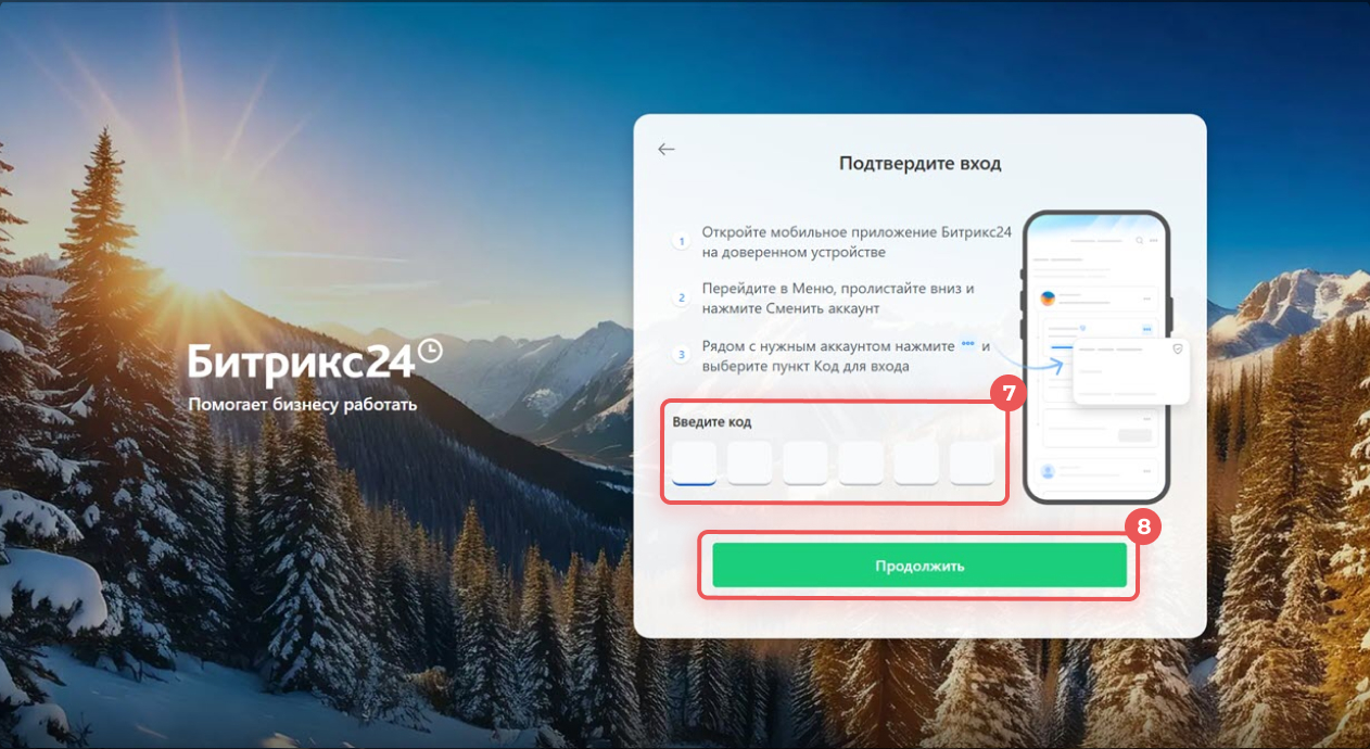 7–8. Вставьте код в Битрикс24 на компьютере. Нажмите Продолжить. После этого вы войдете в Битрикс24 и сможете продолжить работу.