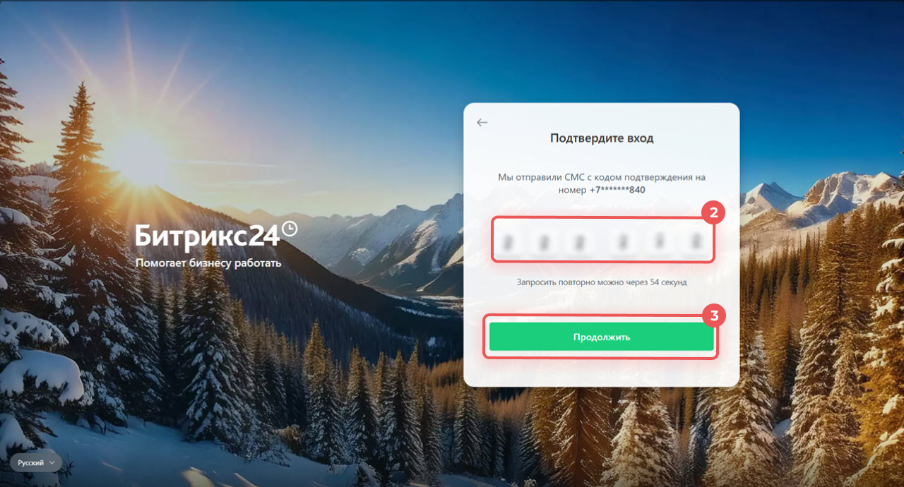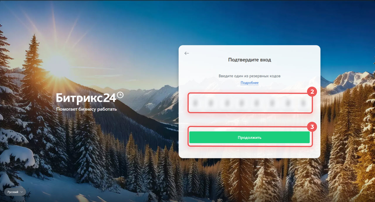 2–3. Вставьте код из сообщения и нажмите Продолжить. После этого вы войдете в Битрикс24.
