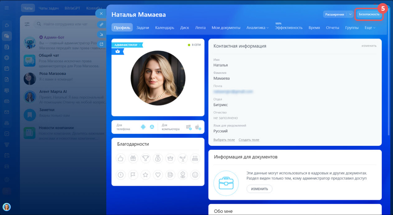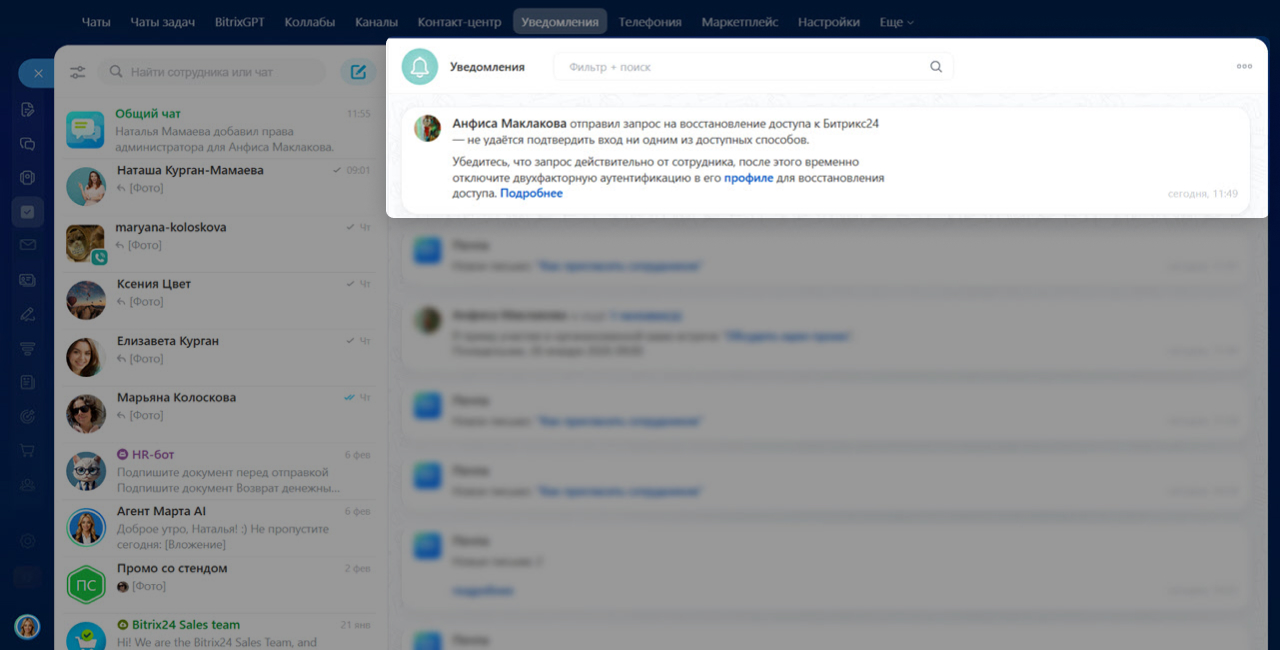 После этого вы получаете уведомление в Битрикс24. Проверьте, действительно ли запрос поступил от этого сотрудника — свяжитесь с ним через любой доступный канал.