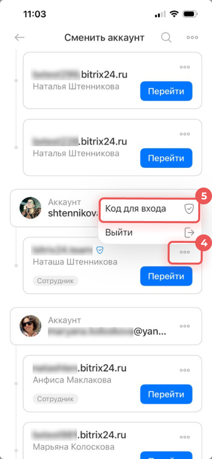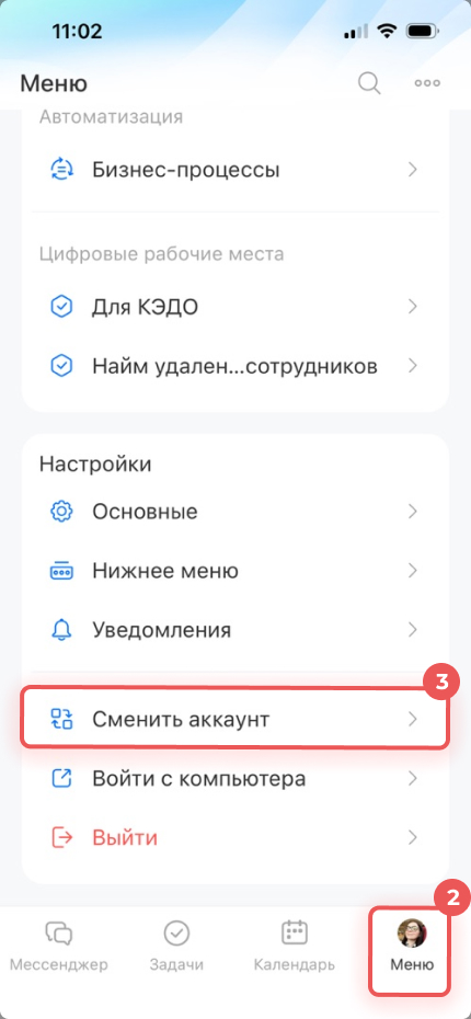2–3. Перейдите в мобильное приложение Битрикс24 на доверенном устройстве. Нажмите Меню > Сменить аккаунт.