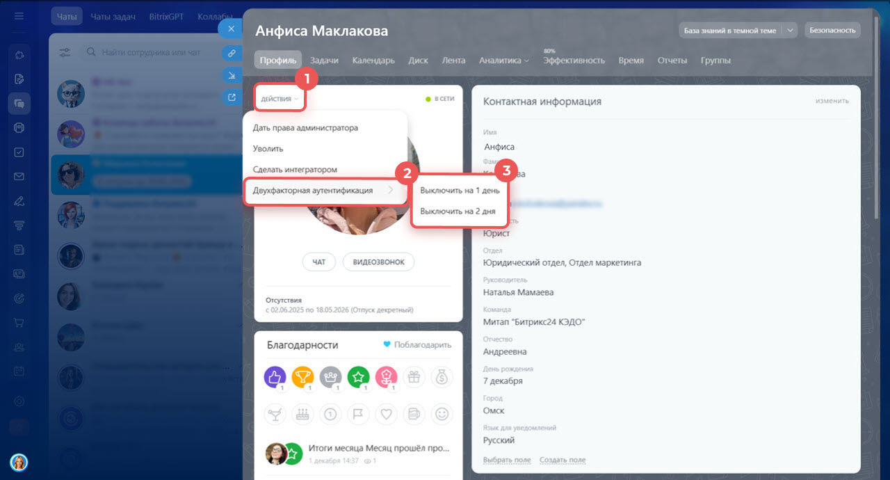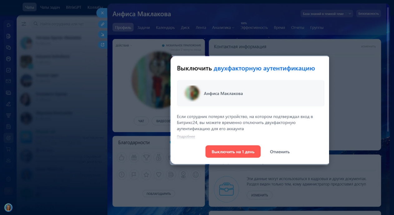 После этого сотрудник сможет войти в Битрикс24 и заново настроить двухфакторную аутентификацию.
