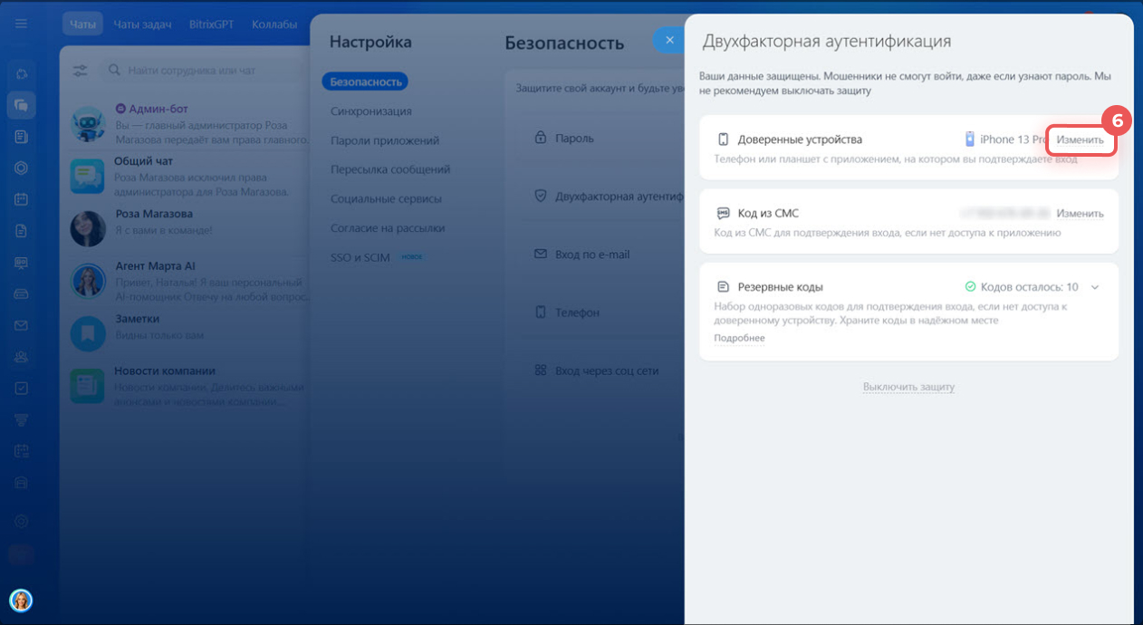 5–6. Заново настройте двухфакторную аутентификацию — для этого привяжите доверенное устройство. В личном профиле перейдите в раздел Безопасность и в блоке Доверенные устройства нажмите Изменить.