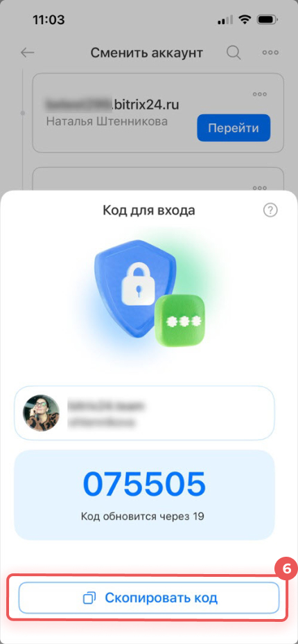 1. Нажмите Код из приложения. Битрикс24 сгенерирует код и отправит его в мобильное приложение.