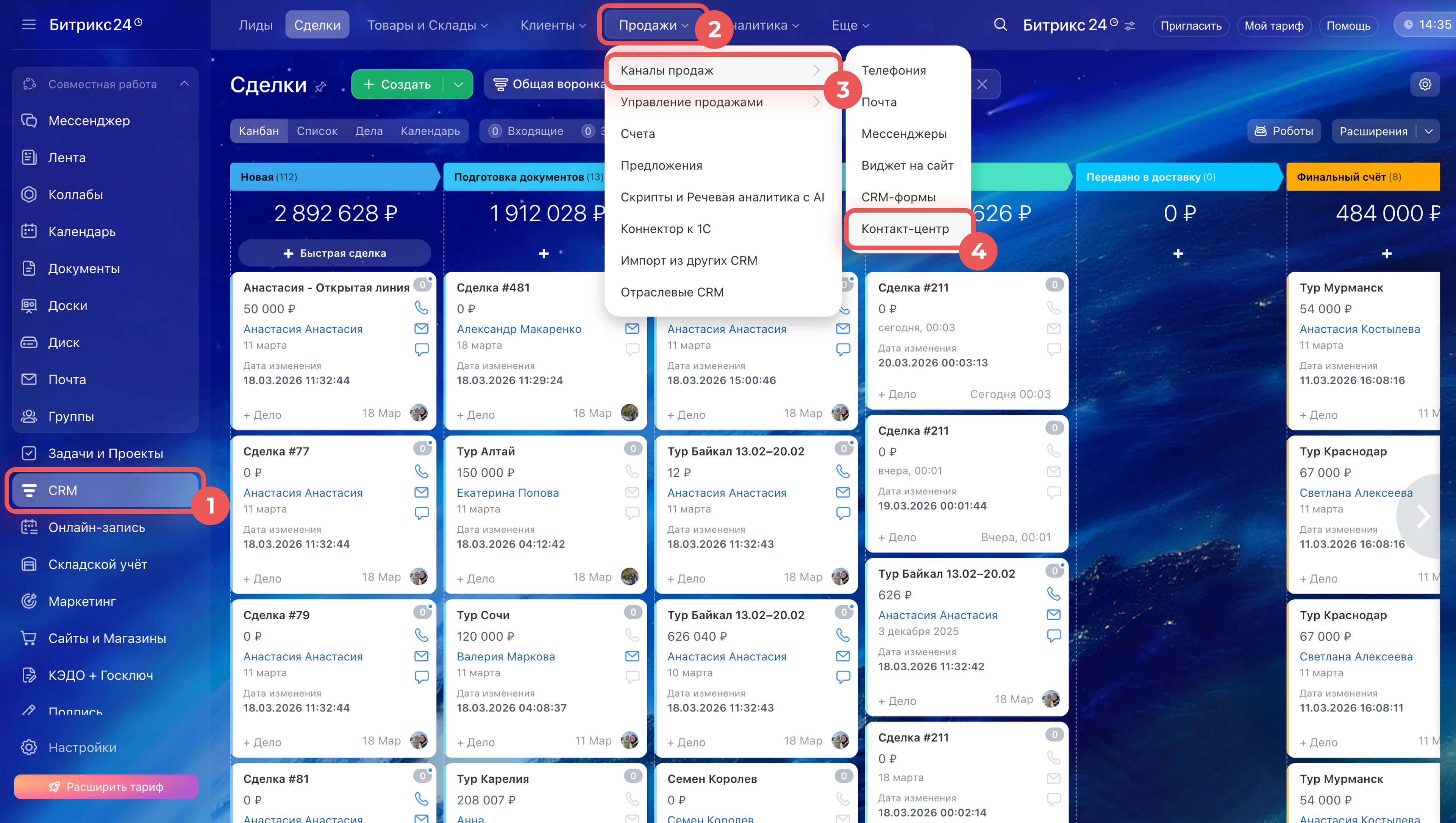 Из раздела CRM. Откройте раздел CRM > Продажи > Каналы продаж > Контакт-центр. Выберите блок CRM + Интернет-магазин и нажмите Создать магазин в один клик.