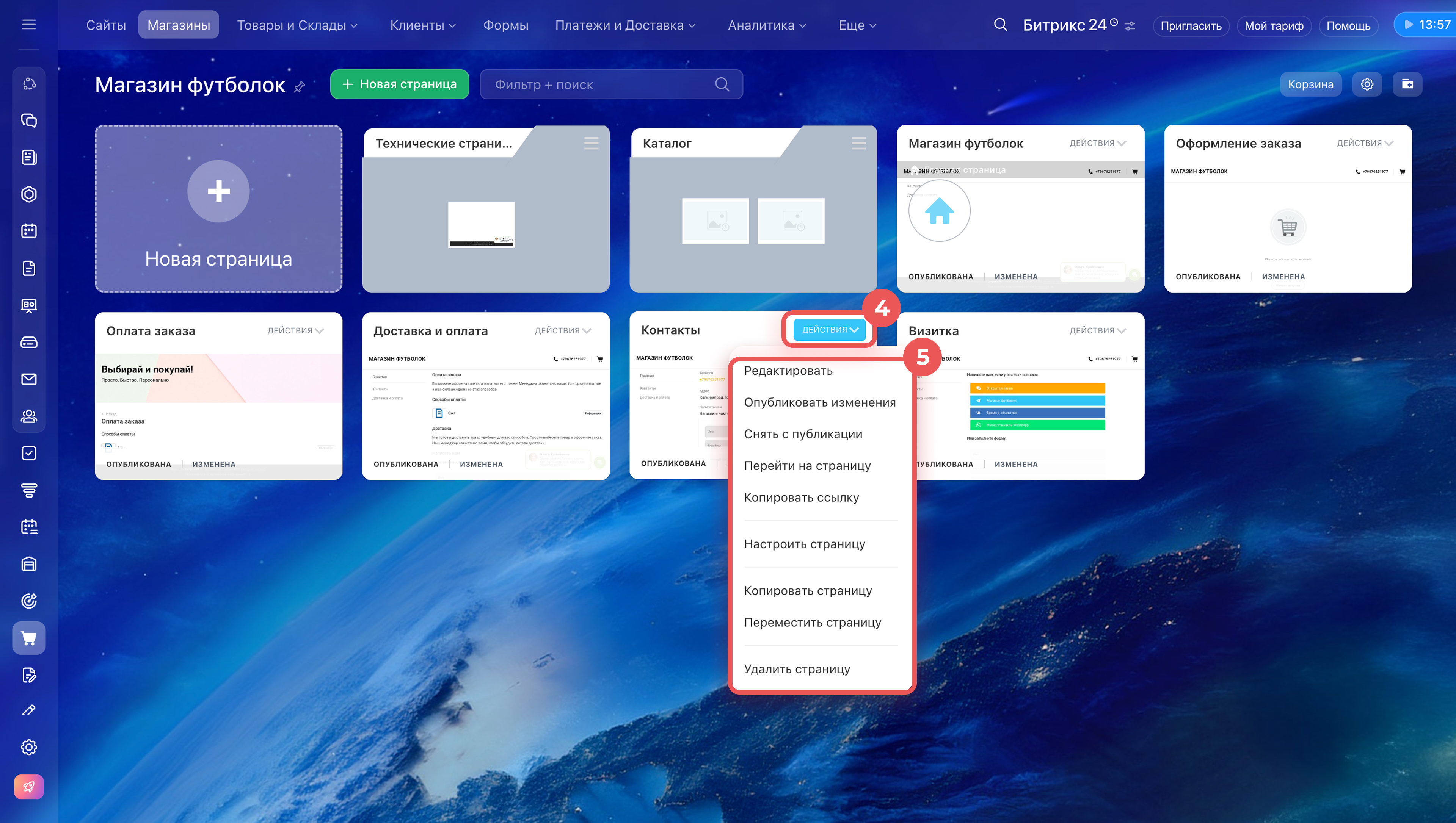Когда основные настройки магазина готовы, при необходимости измените страницы сайта. Для этого откройте Сайты и Магазины > Магазины и нажмите Страницы около нужного магазина.
