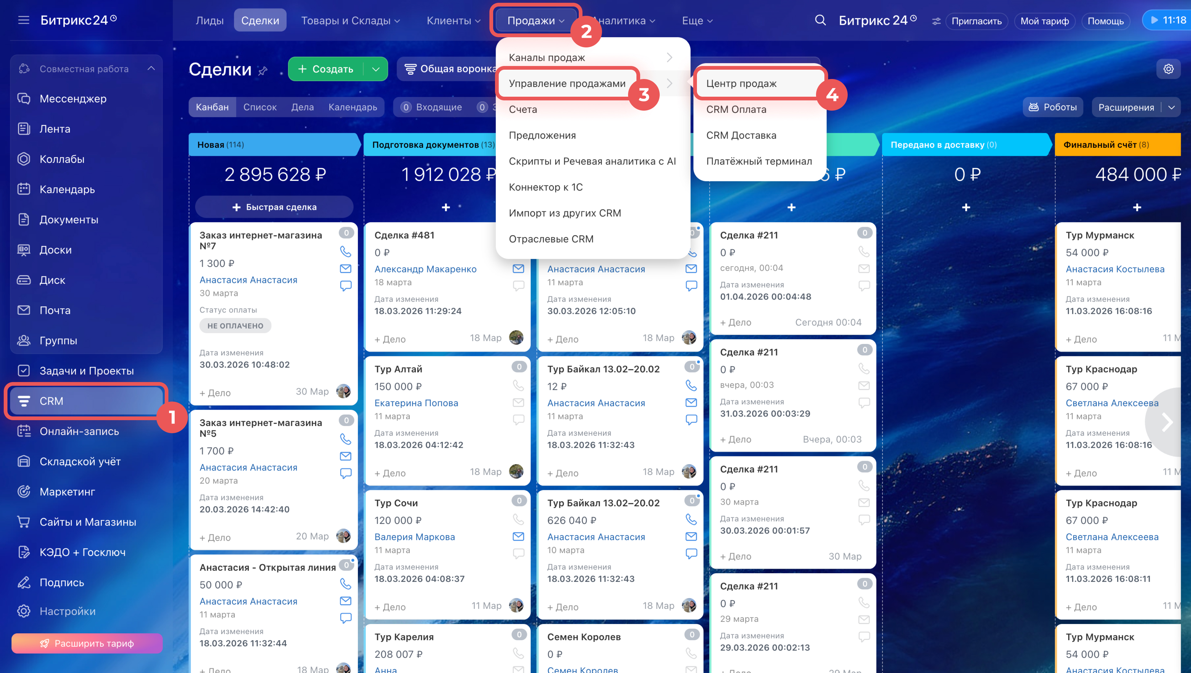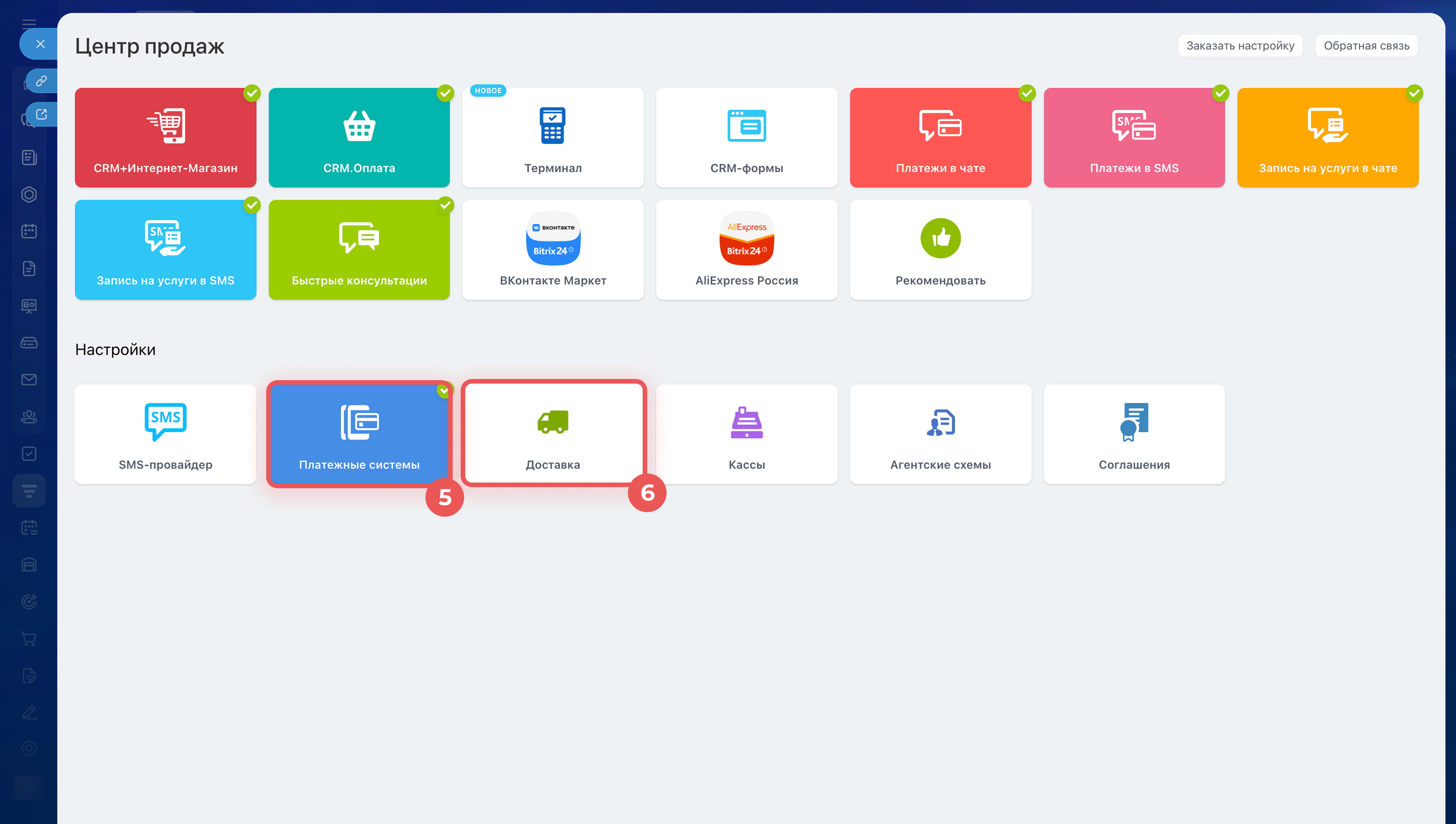 Откройте раздел CRM > Продажи > Управление продажами > Центр продаж. Настройки оплаты и доставки находятся в разных блоках, поэтому их настраивают отдельно.