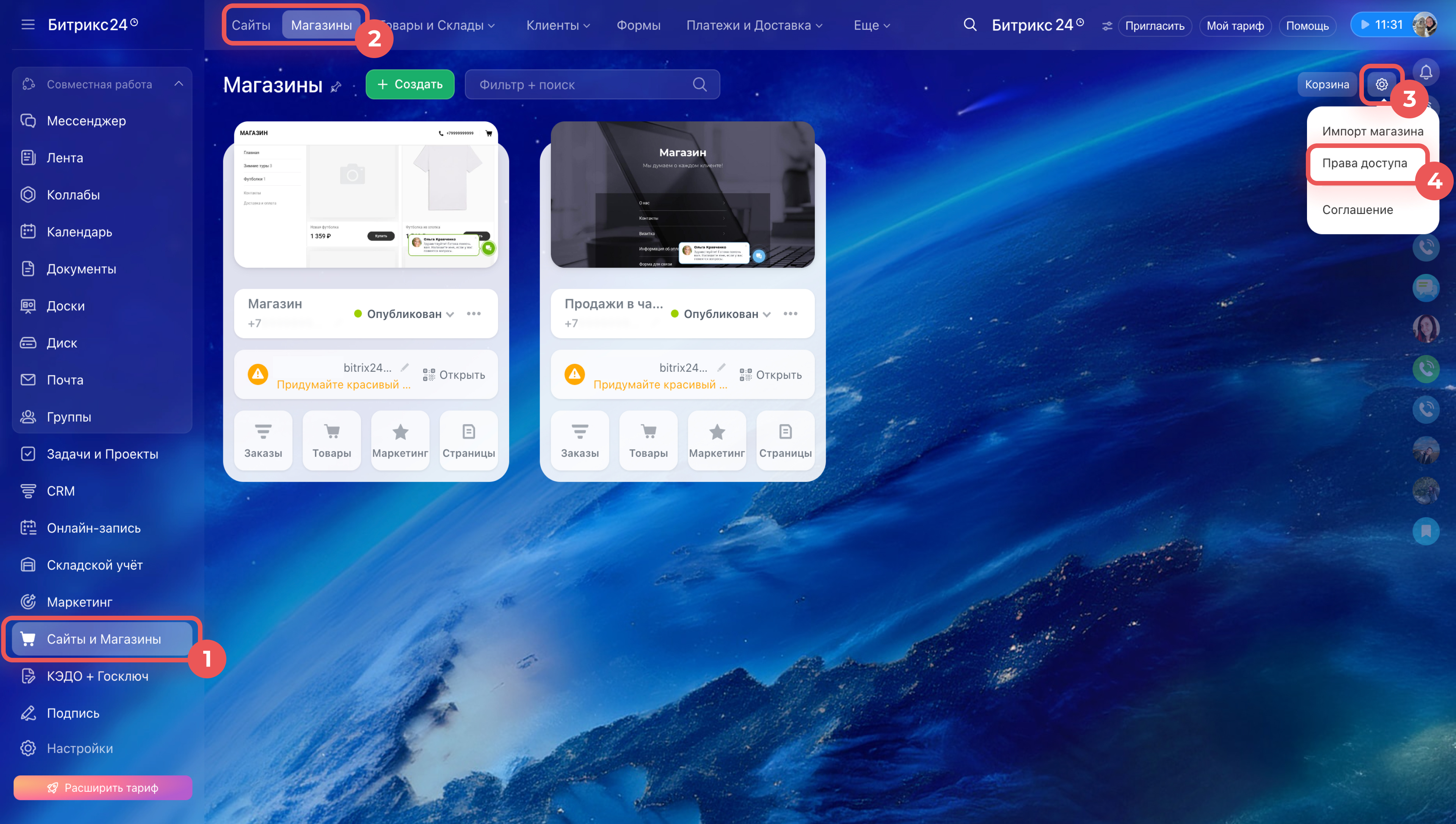 - Магазин можно создать за несколько минут через CRM > Продажи > Каналы продаж > Контакт-центр или через Сайты и Магазины > Магазины.