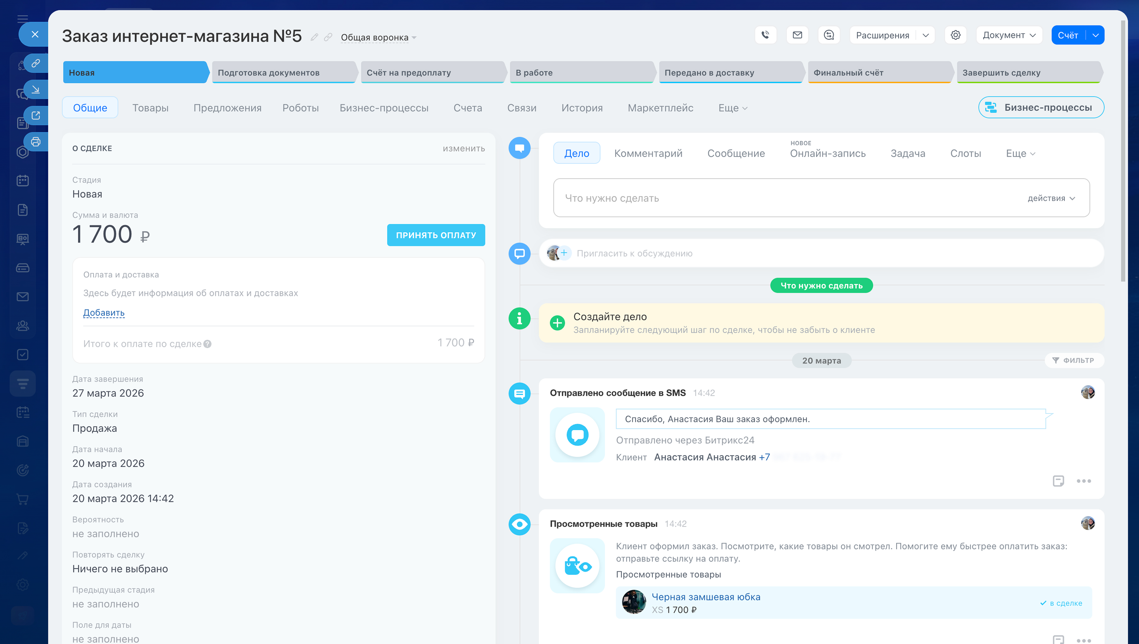 - в CRM автоматически создается сделка с товарами, суммой и контактными данными клиента,
