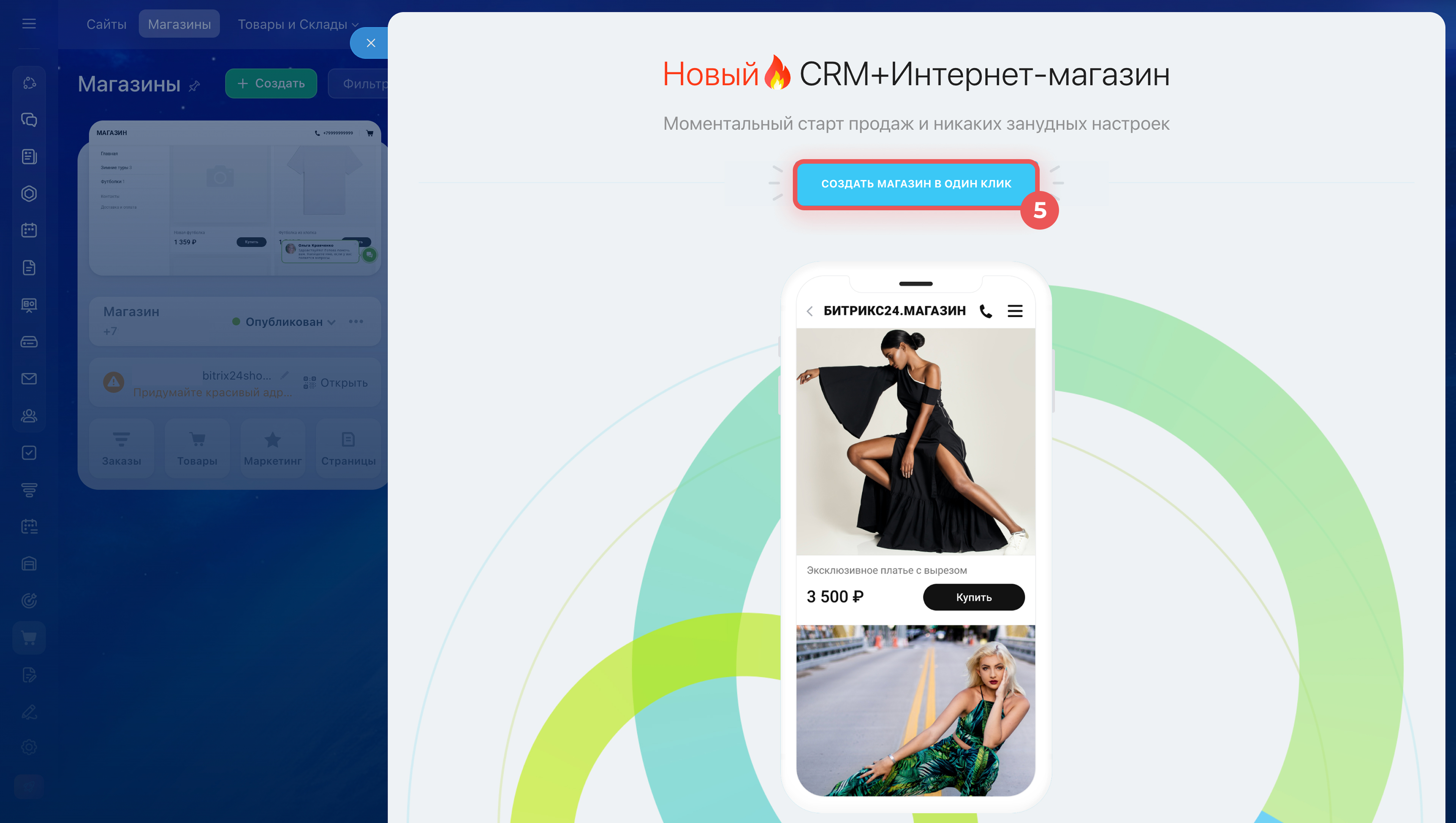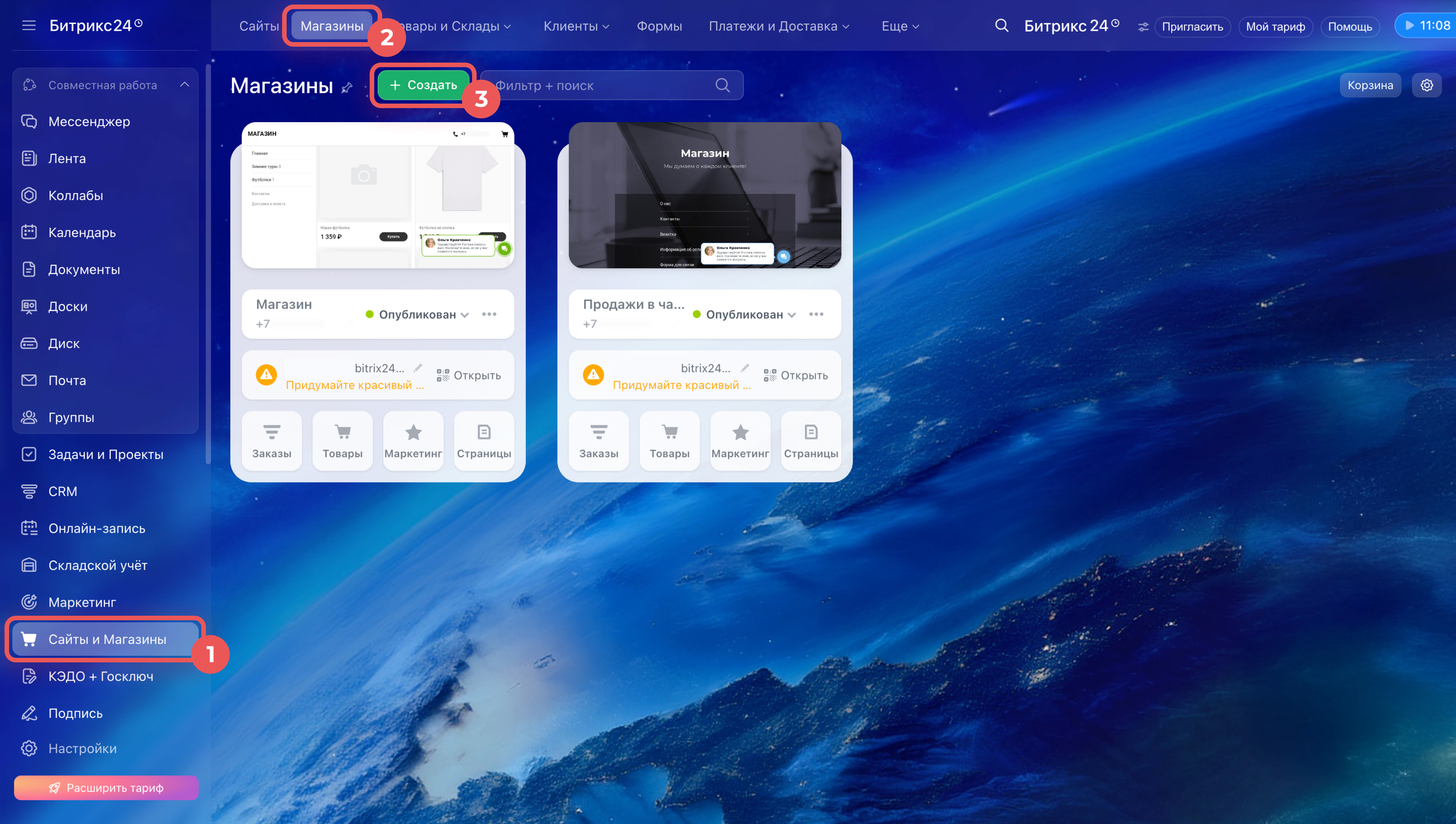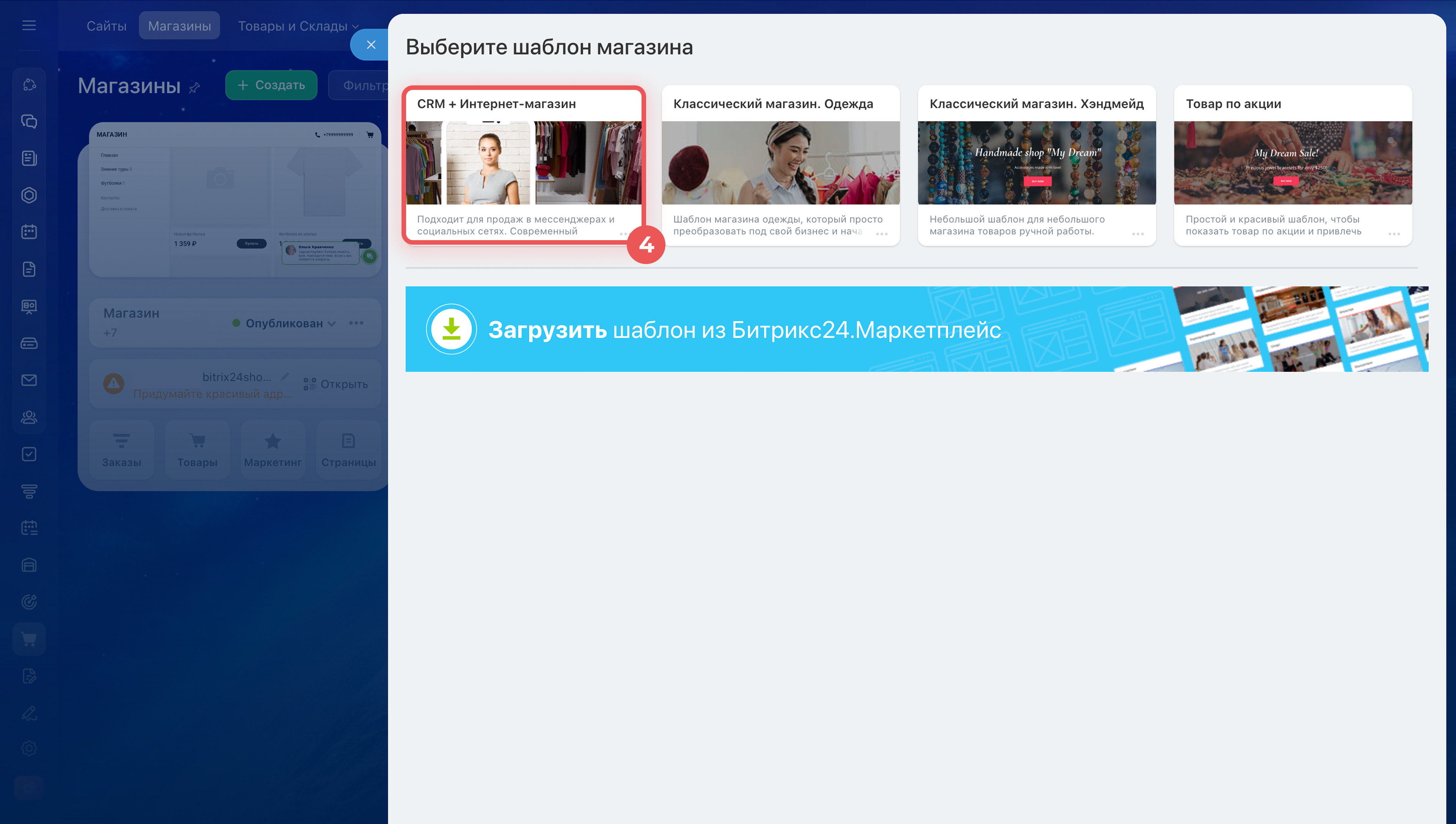 Из раздела Сайты и магазины. Перейдите в Сайты и Магазины > Магазины > Создать. Выберите шаблон CRM + Интернет-магазин и нажмите Создать магазин в один клик.