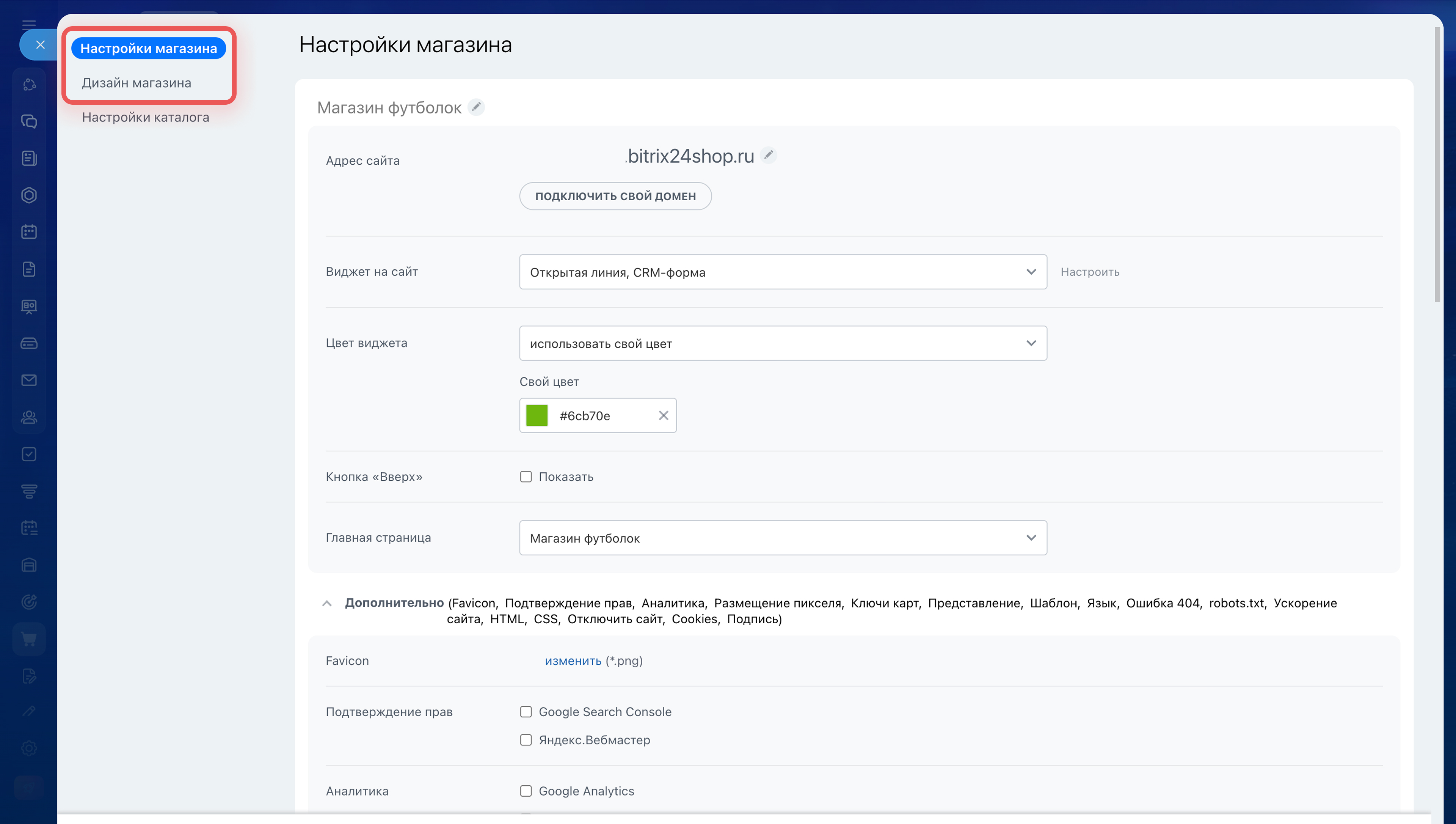 - После создания настройте основные параметры магазина: главную страницу, виджет для связи с клиентами и дизайн.