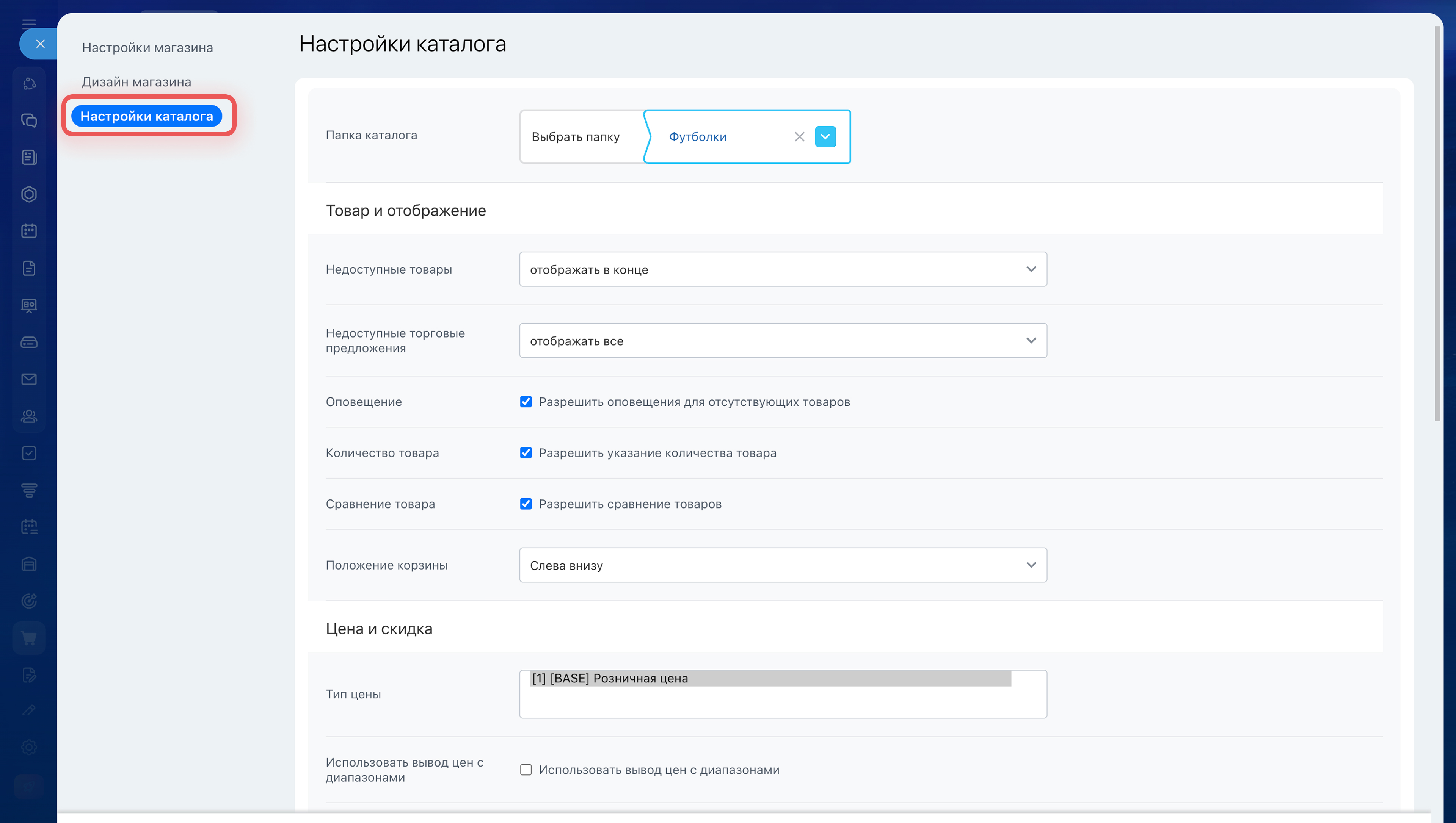 - Затем проверьте каталог товаров: какие позиции показывать на сайте, как отображать недоступные товары, цены, скидки и пользовательское соглашение.