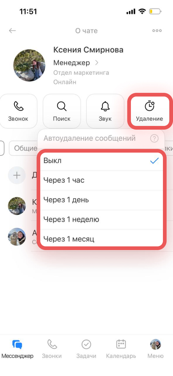 Автоудаление пригодится, если в переписке передавали личные или конфиденциальные данные. Нажмите Удаление и выберите нужный срок, через который сообщения будут удаляться, например, час или месяц.