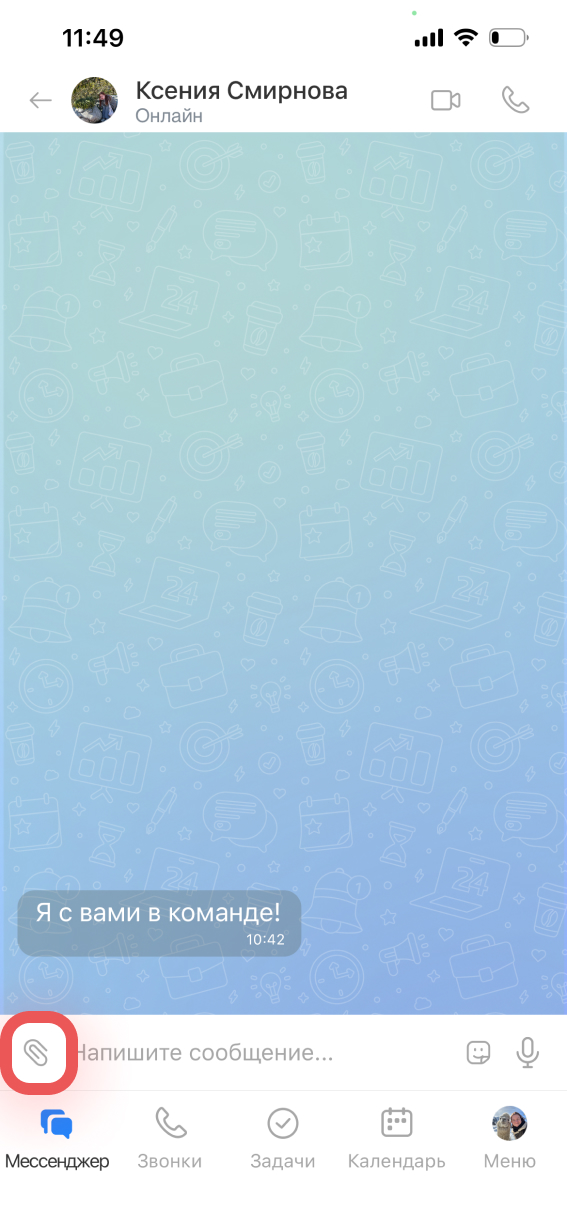 Отправить файл, создать задачу или встречу. Из чата можно сразу передать материалы или поставить задачу коллеге.