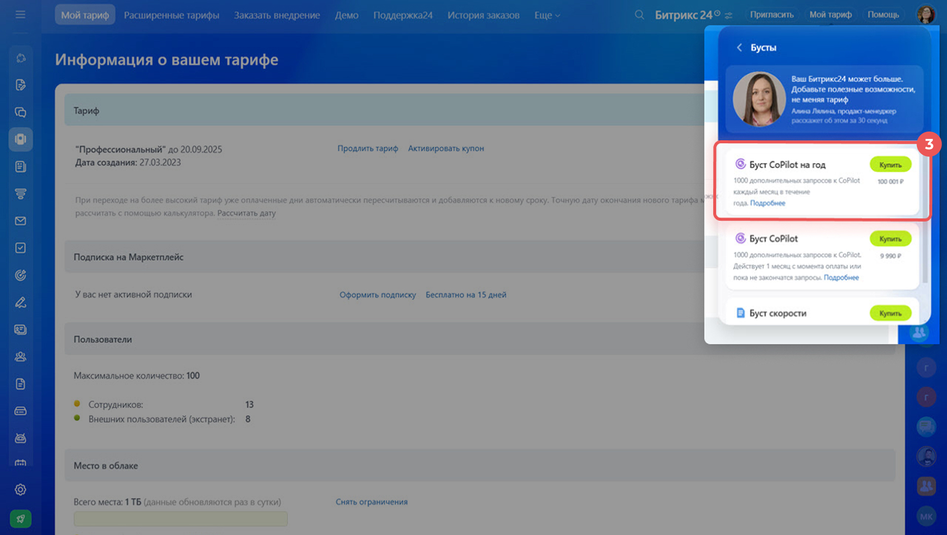 - Купить буст можно у официальных партнеров Битрикс24 или самостоятельно: через виджет Мой тариф и при работе с инструментом при достижении лимита.