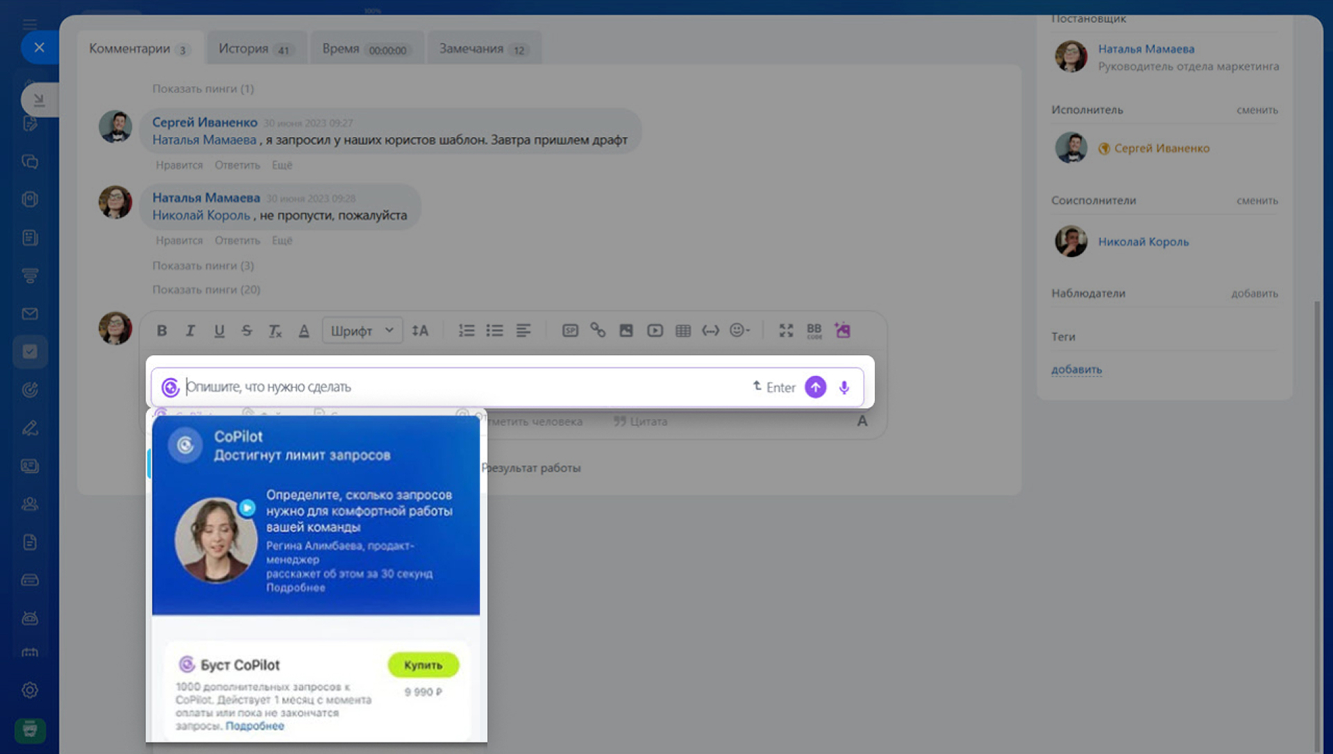 В каждом Битрикс24 предусмотрен бесплатный образовательный пакет — определенное количество запросов к BitrixGPT в месяц. Их количество зависит от тарифного плана. Если команда активно использует AI и лимита не хватает, можно подключить буст и увеличить количество запросов без перехода на другой тариф.