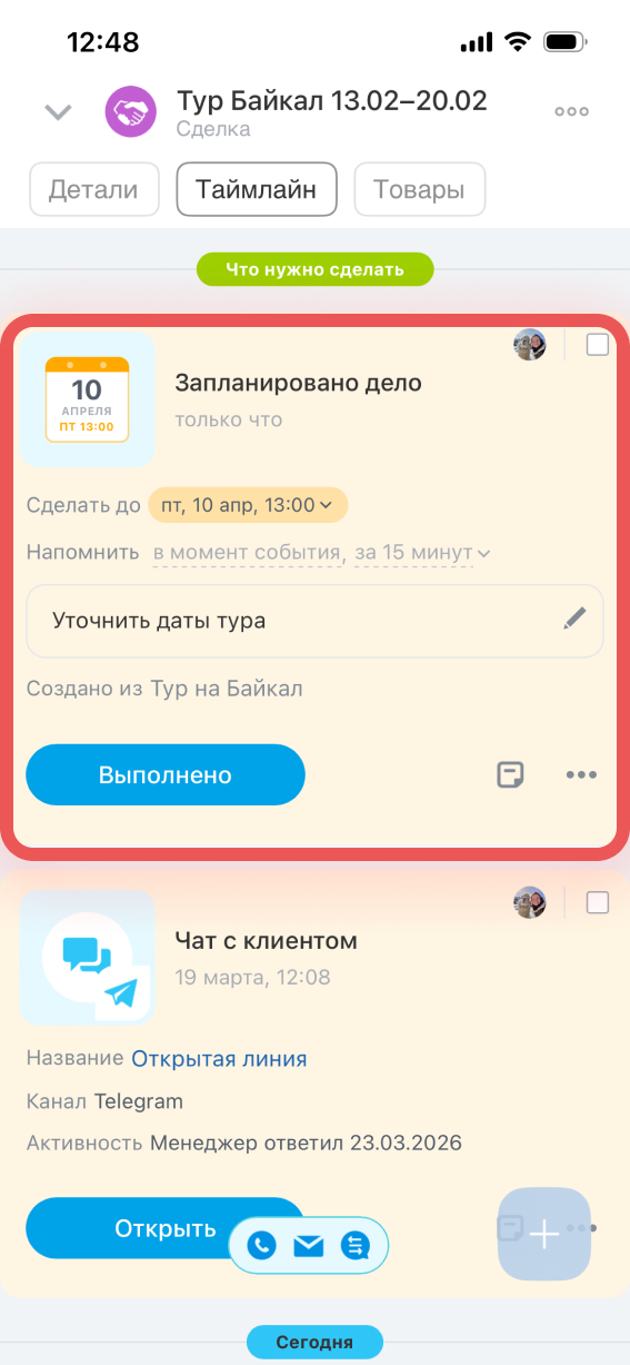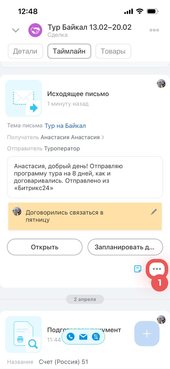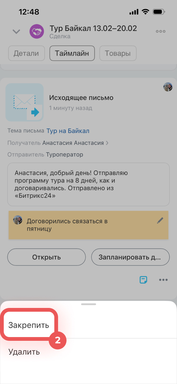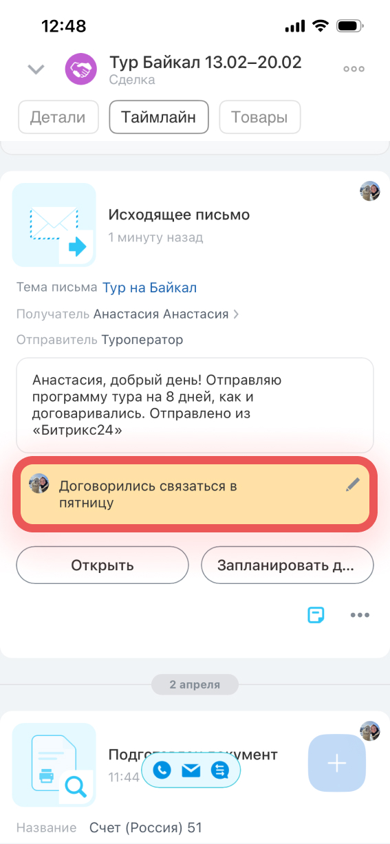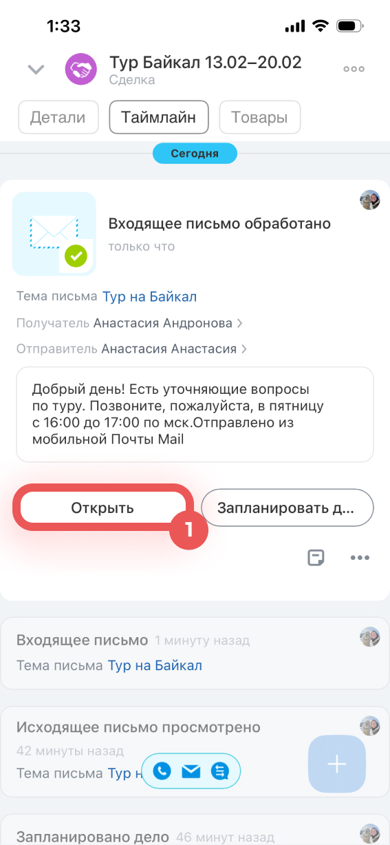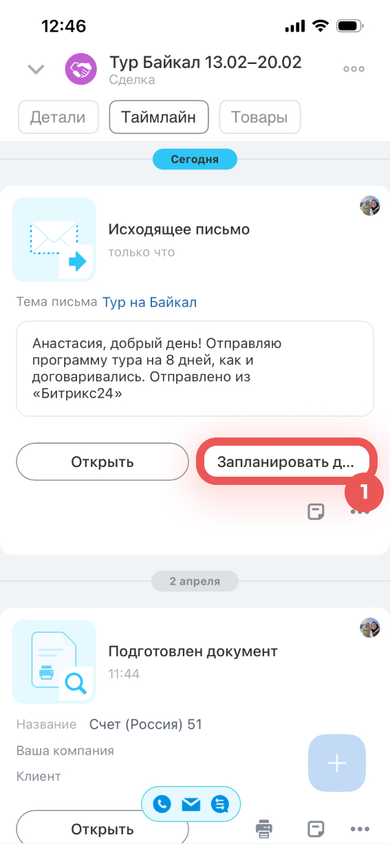 1. В таймлайне в записи о письме нажмите Запланировать дело — откроется форма нового дела.