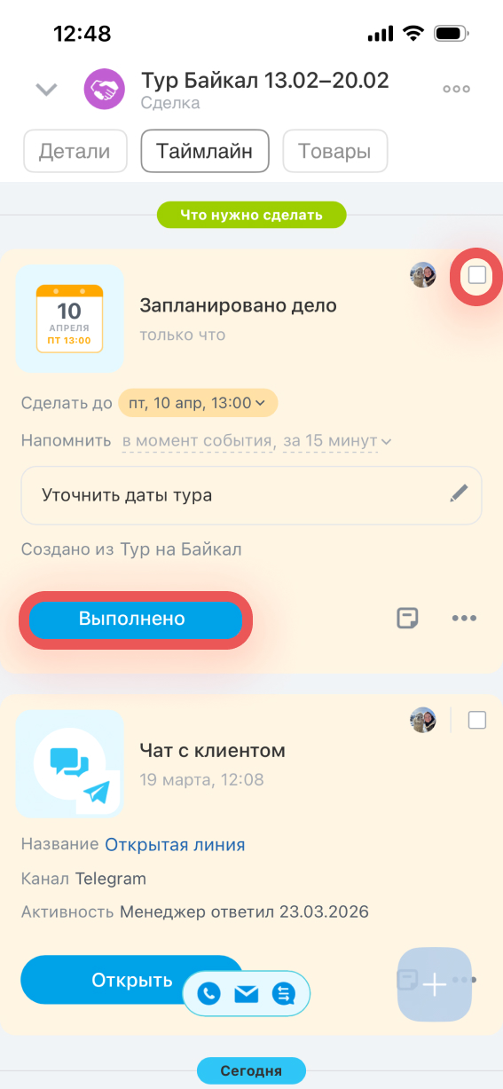 Чтобы завершить дело, поставьте галочку в чекбокс рядом с вашим аватаром или нажмите Выполнено.