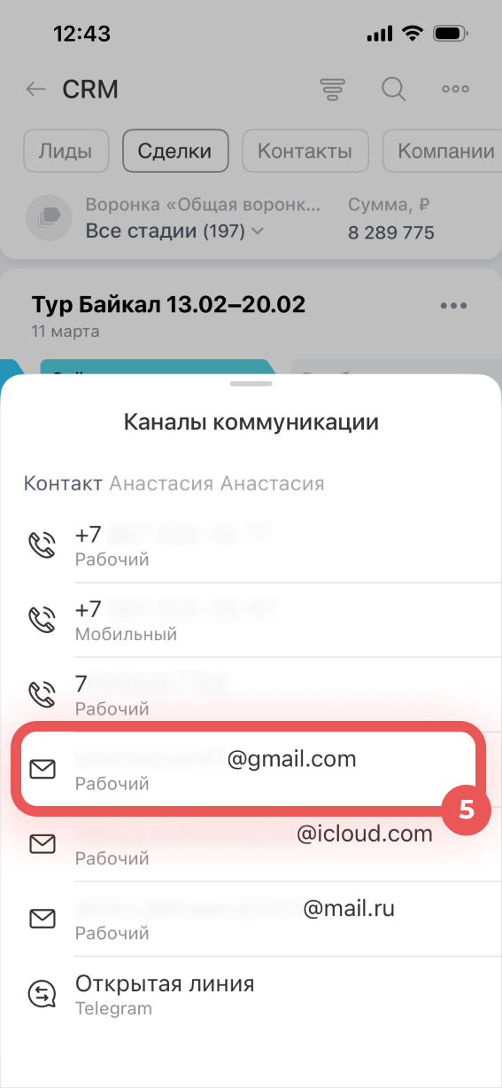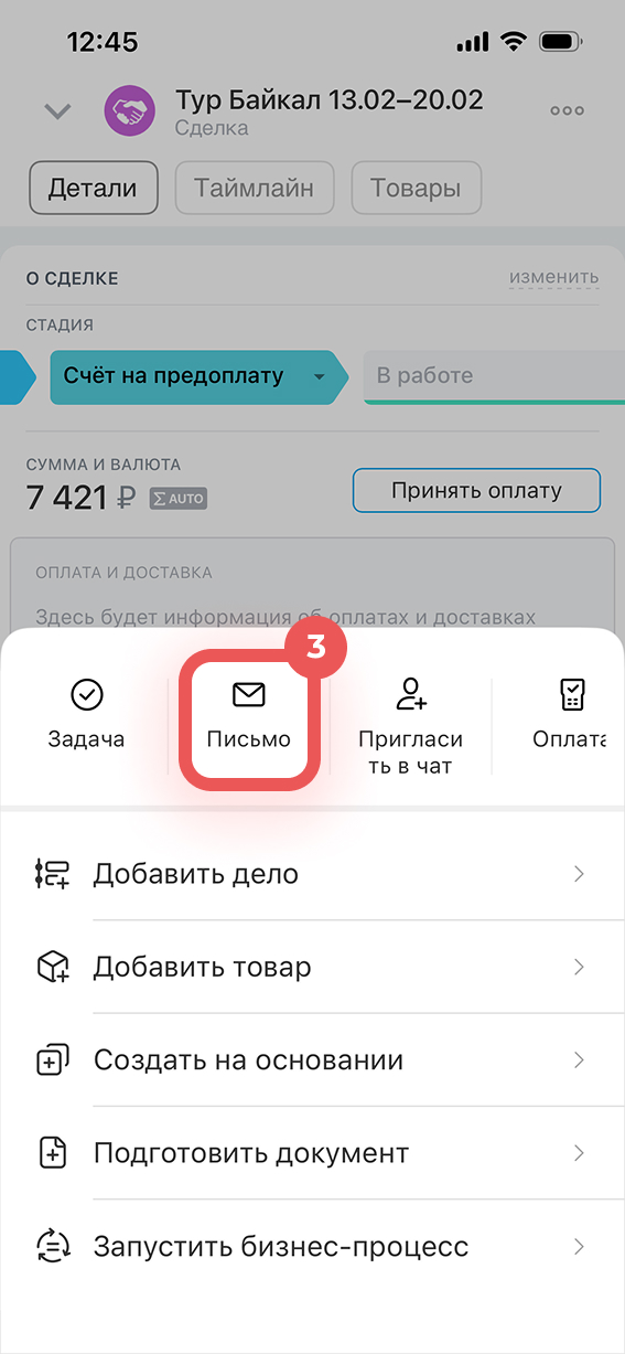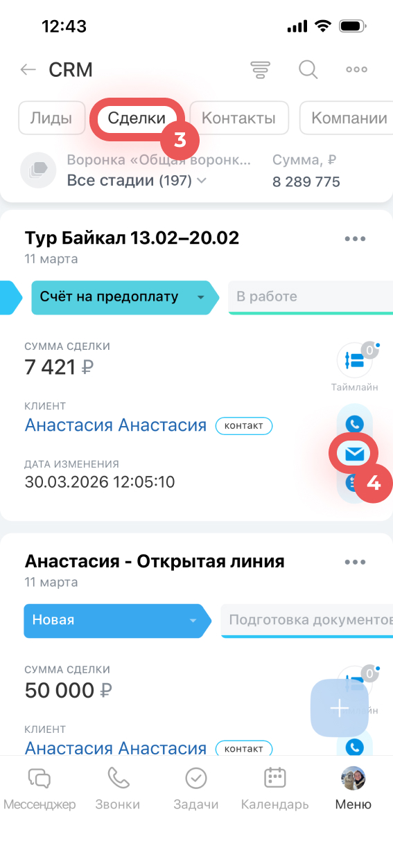 3–4. Выберите раздел, например Сделки. Нажмите на конверт рядом с нужной сделкой.