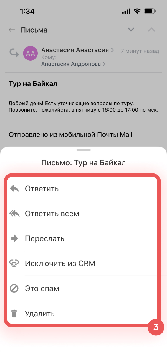 - Исключить из CRM — если письмо не связано с работой по клиенту, вы можете добавить адрес отправителя в список исключений CRM. Письма с этого адреса больше не будут автоматически попадать в CRM, но вы сможете прочитать их в почте.