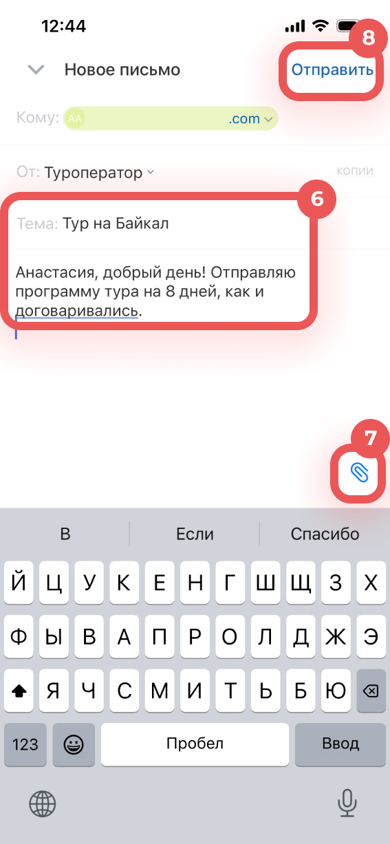 6–8. Укажите тему и напишите текст письма. Чтобы прикрепить файл, нажмите на скрепку. Нажмите Отправить.