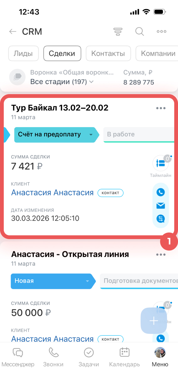 Этот способ удобен, если нужно быстро связаться с клиентом, не открывая карточку.