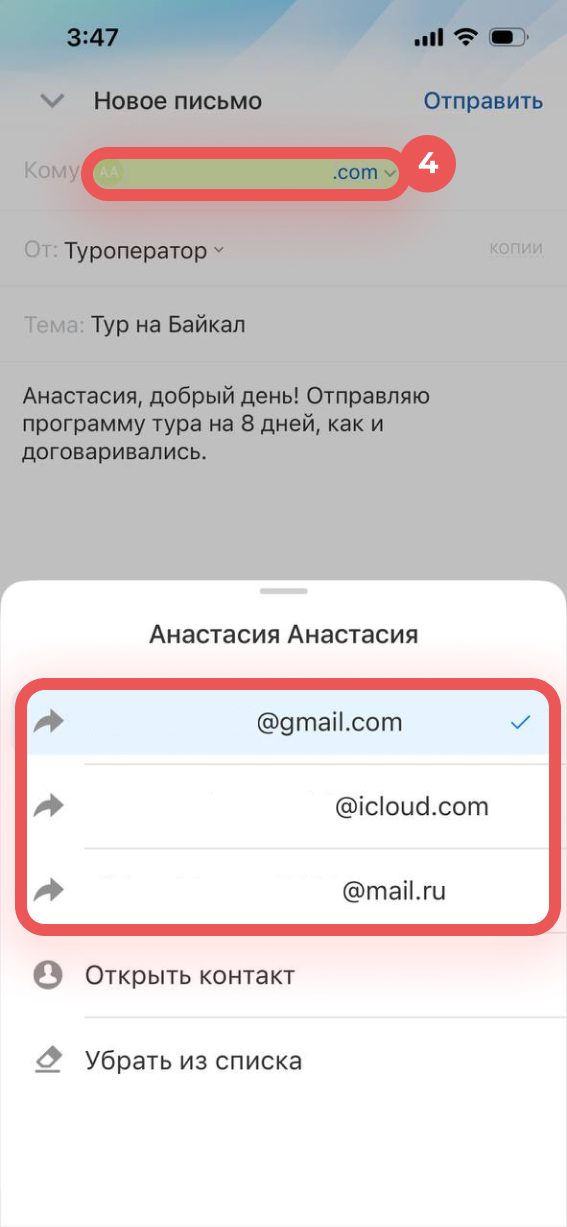 4. Если у клиента несколько email-адресов, в поле Кому автоматически подставится первый из списка. При необходимости нажмите на ⋁ рядом с адресом и выберите другой.