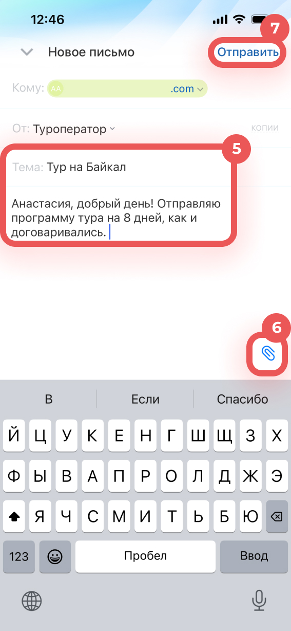 5–7. Укажите тему и напишите текст письма. Чтобы прикрепить файл, нажмите на скрепку. Нажмите Отправить.