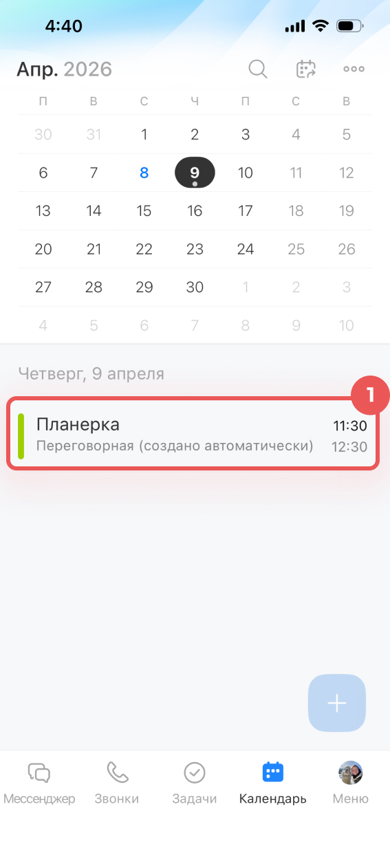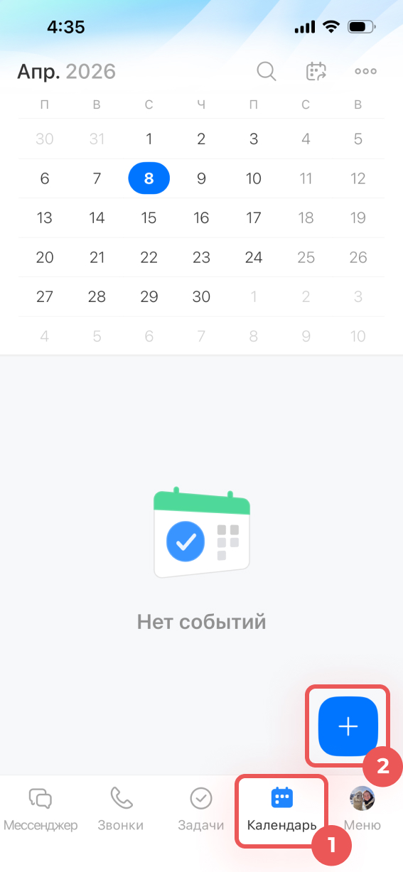 1–2. Откройте раздел Календарь и нажмите Плюс (+).