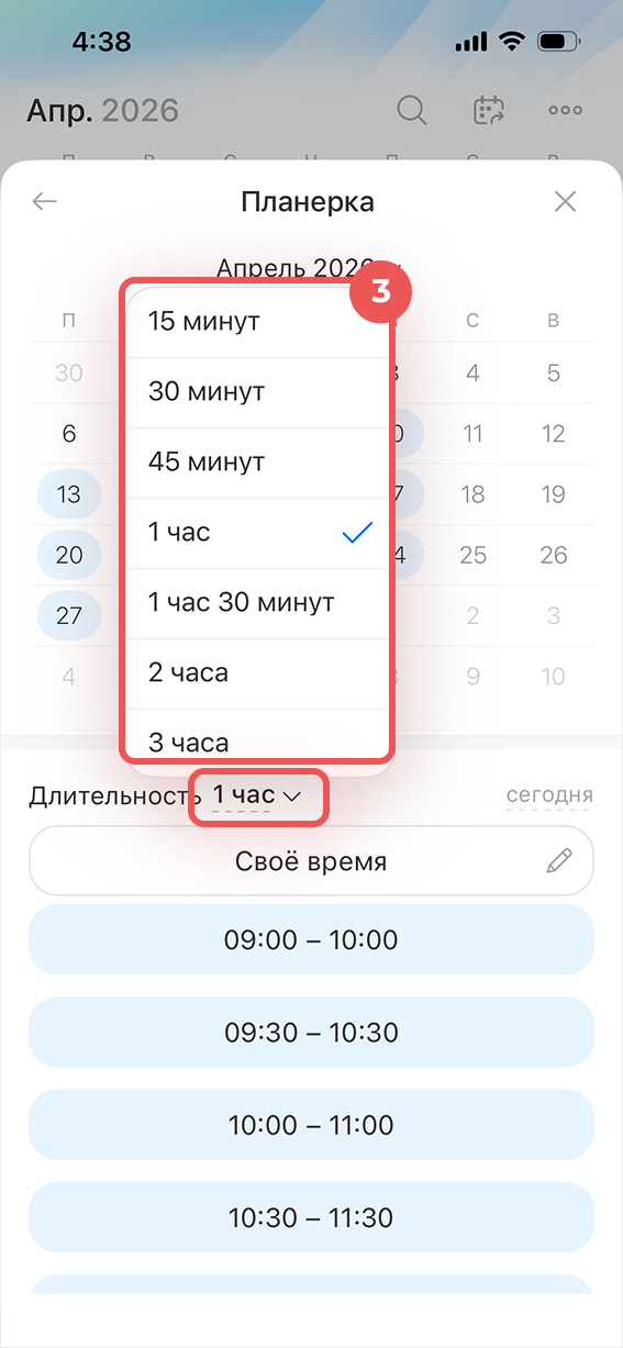 3. Укажите длительность — нажмите на текущее значение рядом с Длительность и выберите из списка.