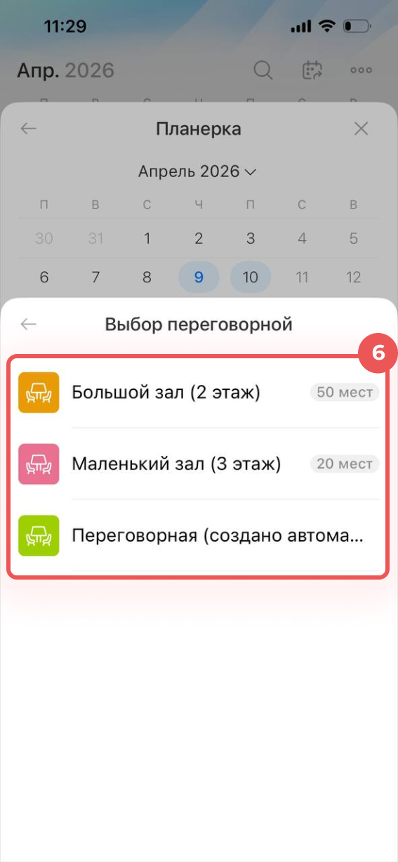 6. Выберите переговорную из списка доступных.