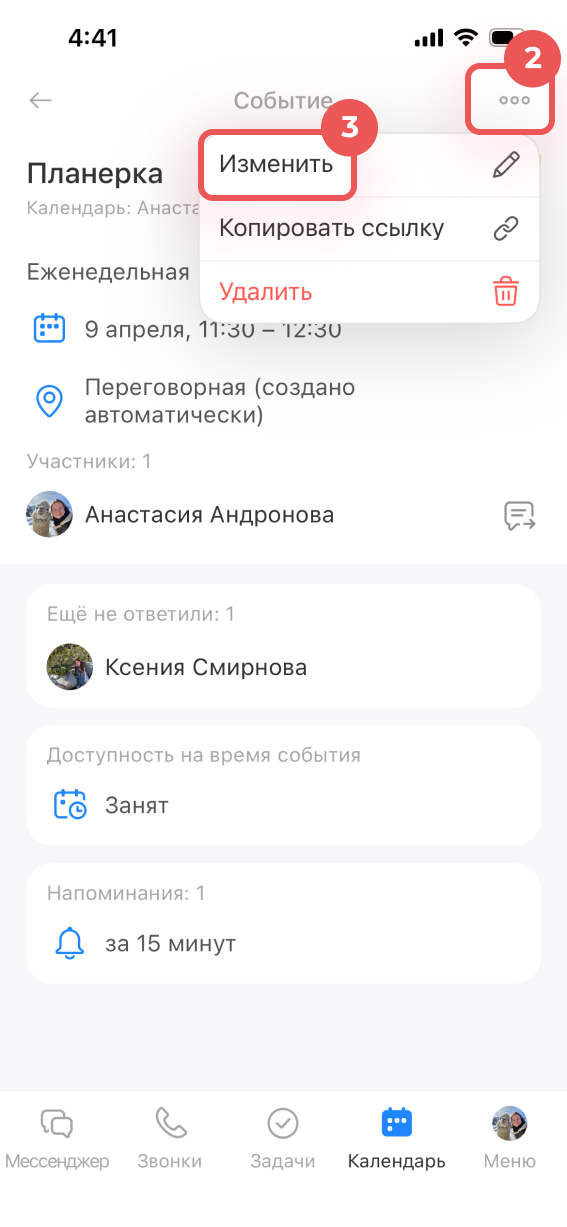 Если время встречи сдвинулось или состав участников поменялся, событие можно отредактировать.