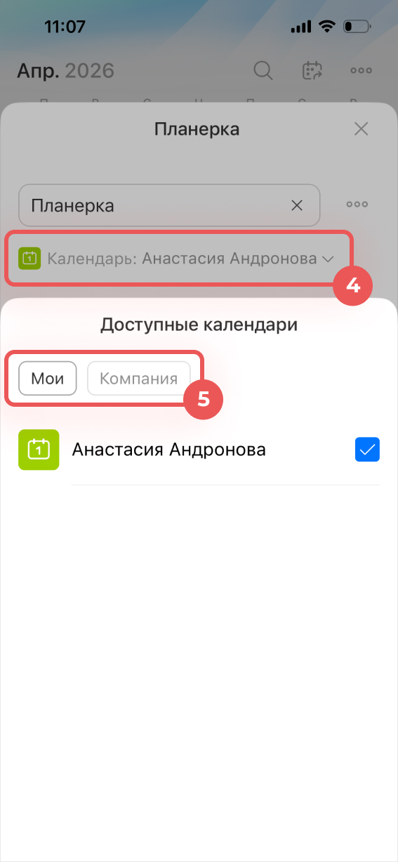 4–5. Нажмите на поле Календарь, чтобы выбрать, в какой календарь добавить событие — личный, календарь компании или другого сотрудника. Календари компании и других сотрудников доступны, если у вас есть на это права.