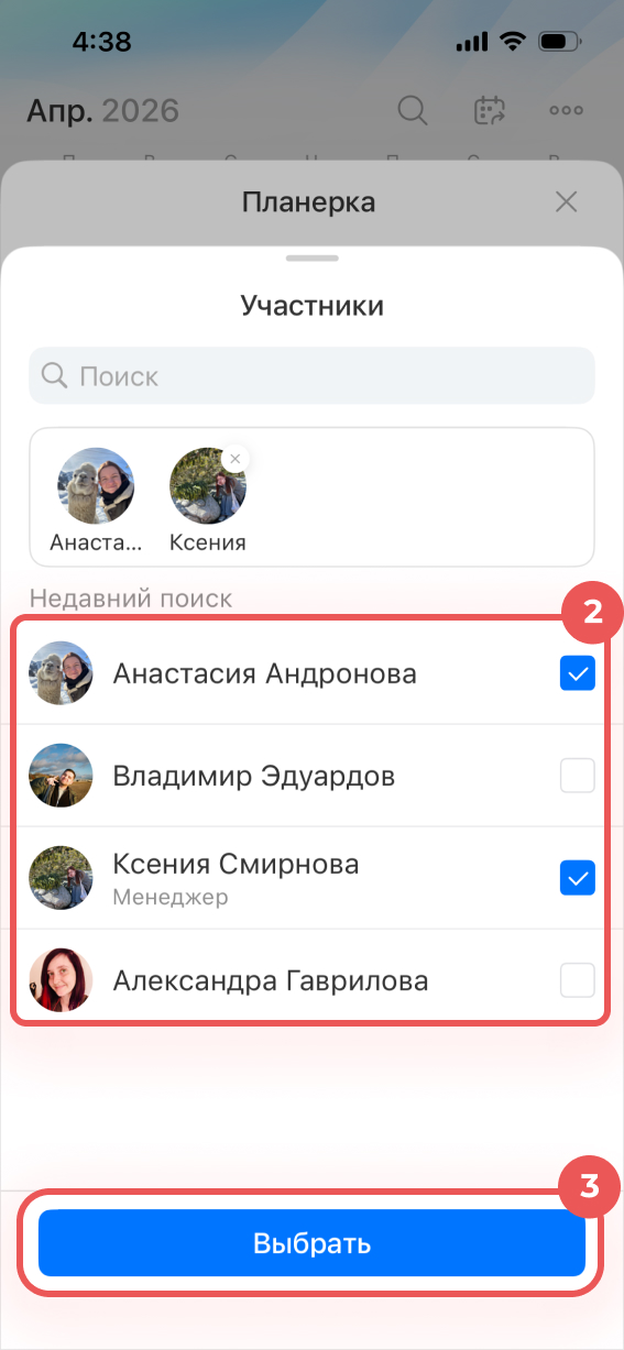 2–3. Найдите коллег по имени или выберите из списка, отметьте их галочками. Нажмите Выбрать.