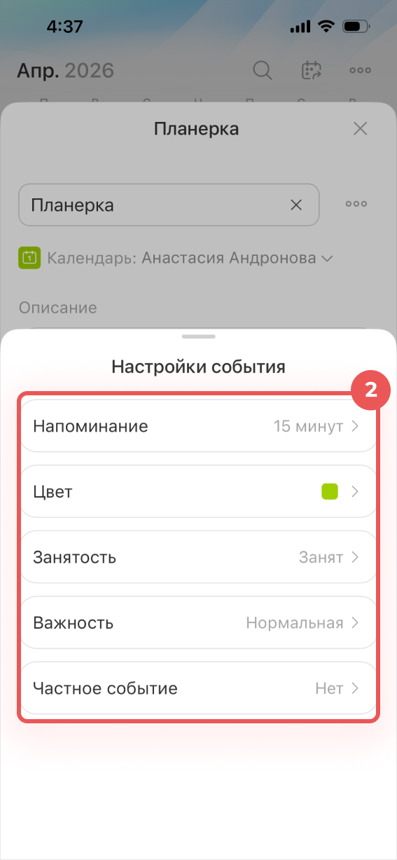 - Цвет — цветовая метка события в календаре.