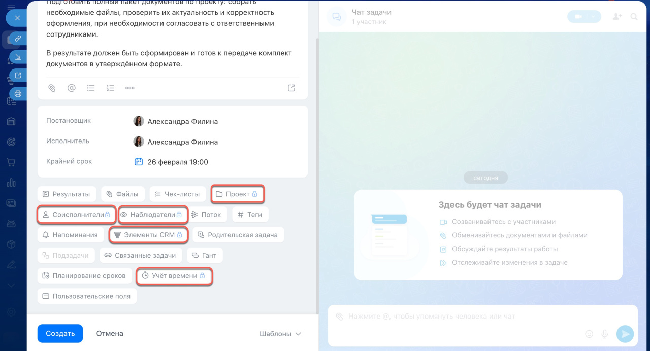 - Добавлять соисполнителя или наблюдателя.
