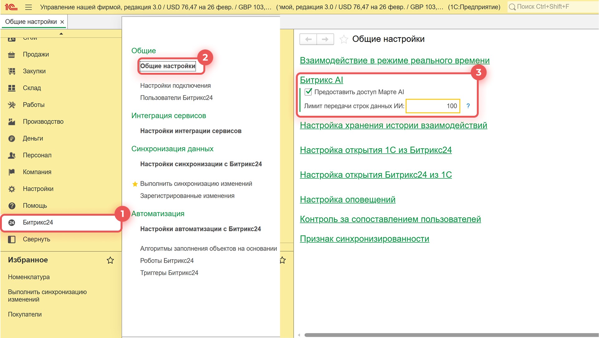 - Подсистема Битрикс AI позволяет получать данные из базы 1С в чате с Агентом Марта AI. Пользователь задает вопрос в чате, а Агент Марта выполняет настроенный запрос в 1С и возвращает результат.