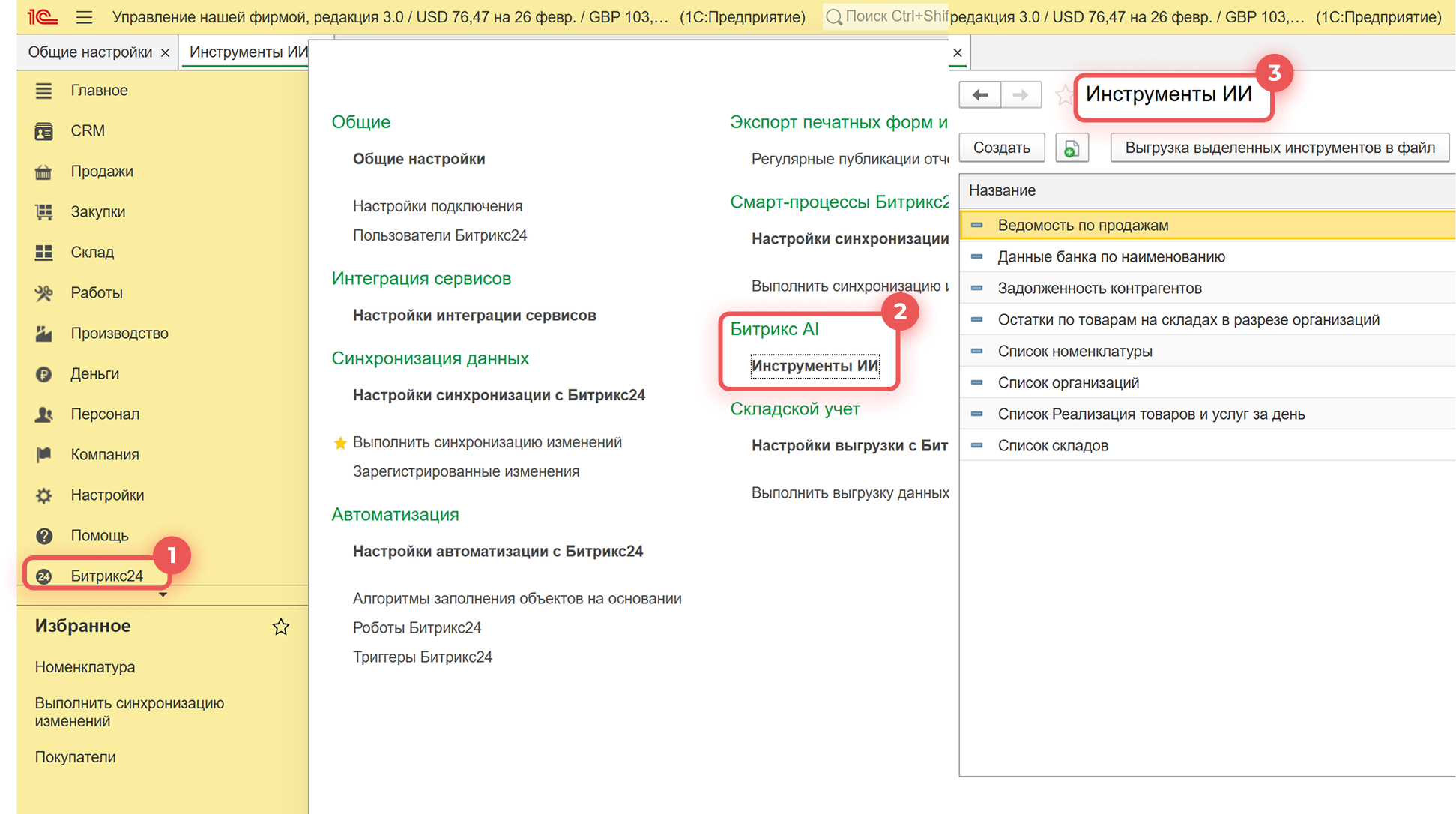 Инструменты ИИ находятся в разделе Битрикс24 > Битрикс AI > Инструменты ИИ. Это справочник, в котором хранятся настроенные запросы к базе 1С.