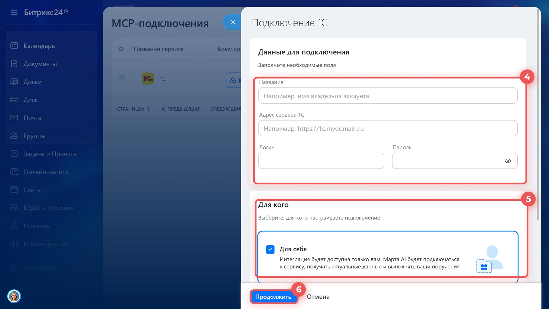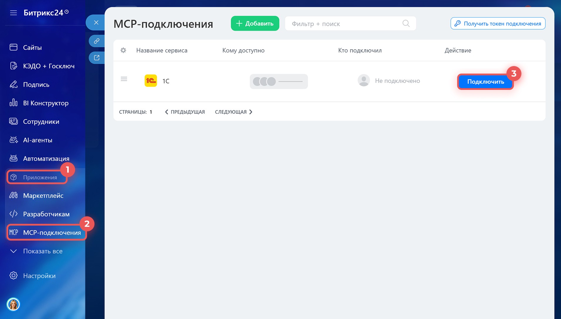 1–3. В Битрикс24 откройте раздел Приложения > MCP-подключения. Выберите 1С и нажмите Подключить.