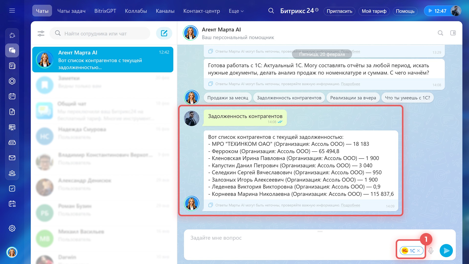 После подключения откройте чат с Агентом Мартой. В правом нижнем углу выберите подключение 1С и задайте вопрос. Марта обработает запрос и сформирует ответ на основе данных из 1С.