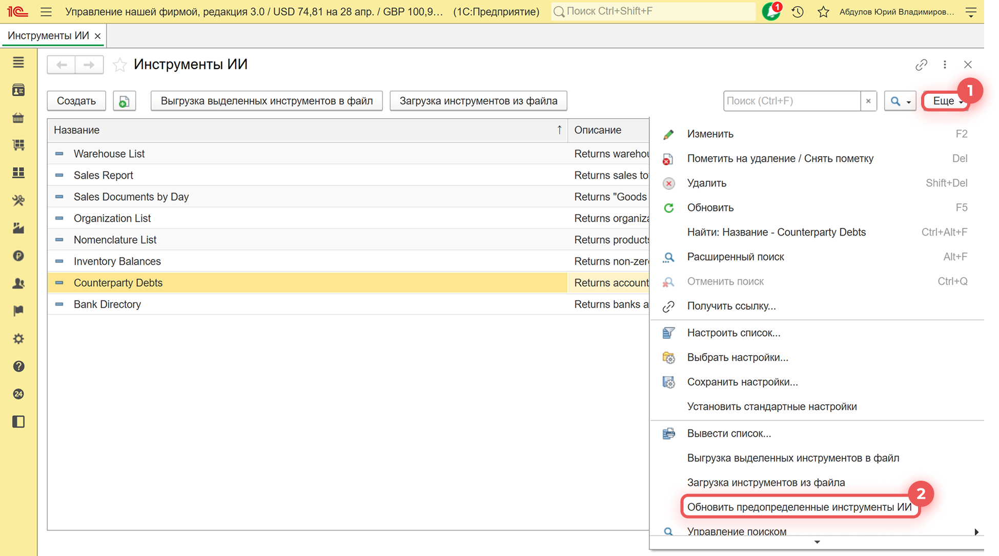 По умолчанию в Битрикс AI уже есть набор настроенных инструментов, с которыми может работать Агент Марта. Если их изменили или удалили, инструменты можно восстановить. Для этого нажмите Еще > Обновить предопределенные инструменты ИИ.