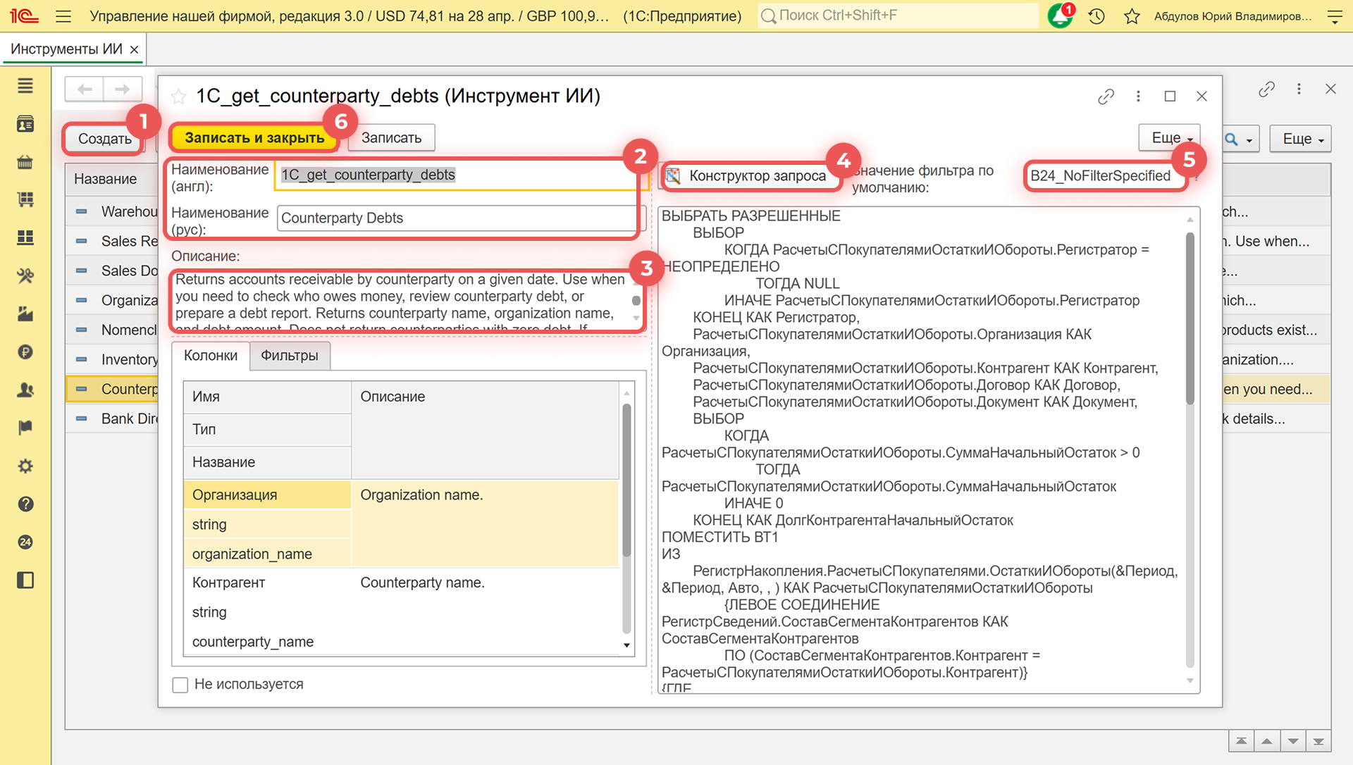 - Запрос к базе 1С — сформируйте запрос с помощью кнопки Конструктор запроса или вручную. После изменения запроса автоматически заполняются вкладки Колонки и Фильтры. Эти данные также участвуют в выборе инструмента для ответа пользователю.