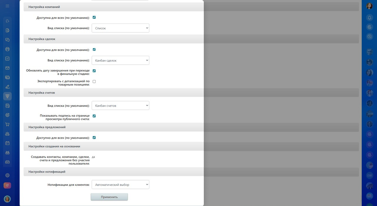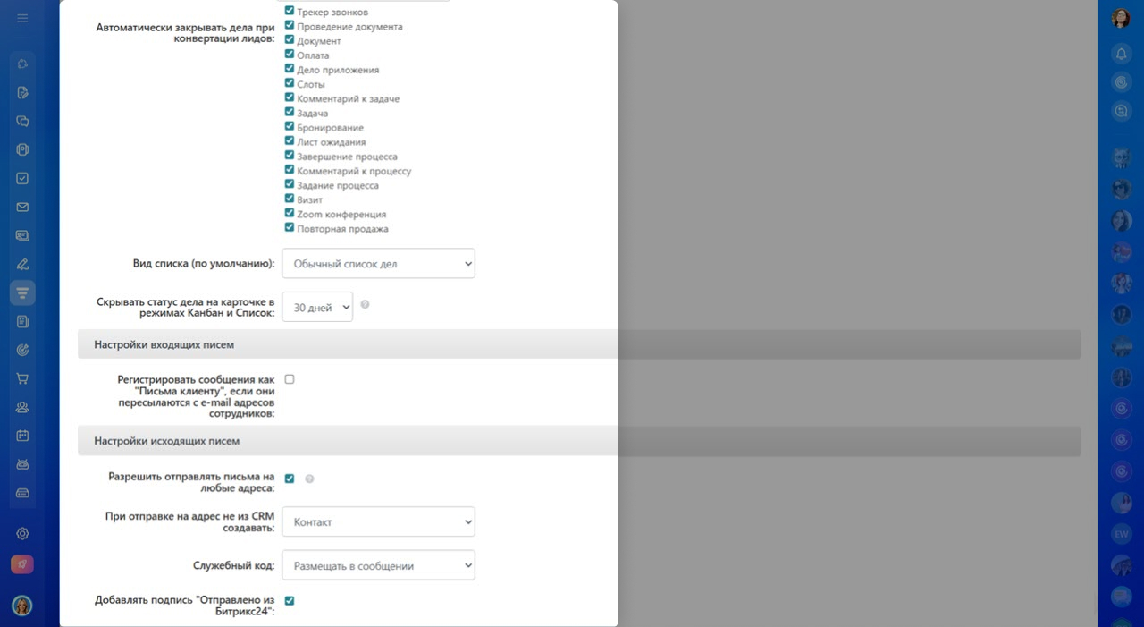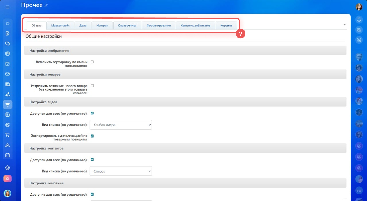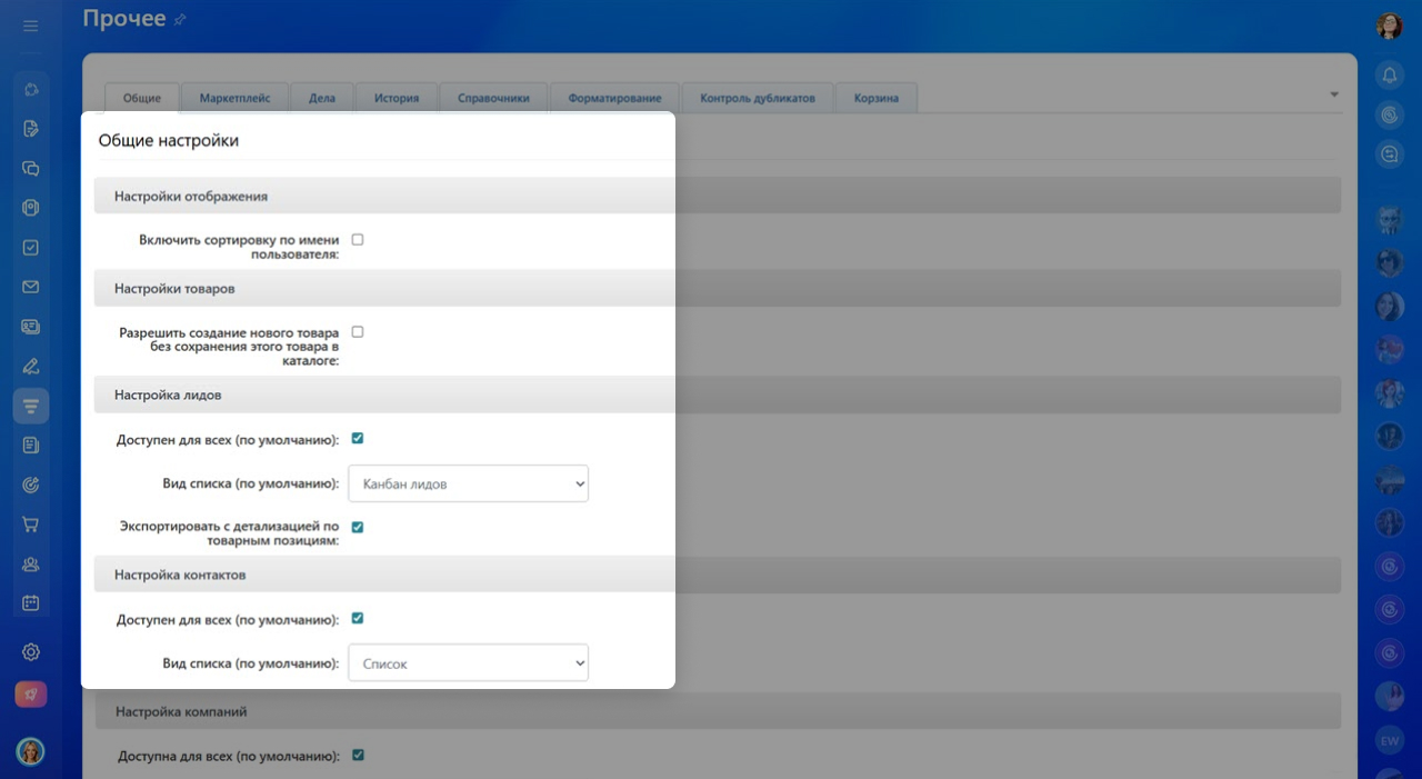 - В разделе Прочие настройки CRM можно гибко настраивать работу CRM под процессы вашей компании.