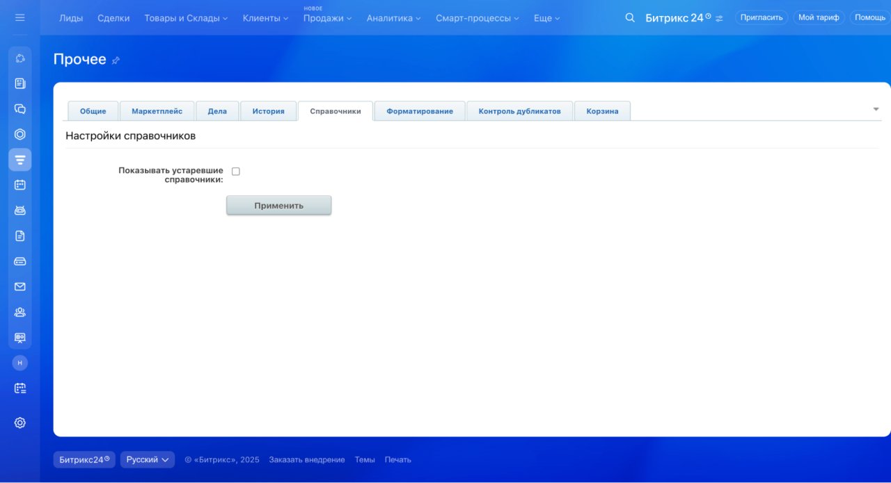 Показывать устаревшие справочники — опция открывает доступ к старым справочникам CRM, например к Продуктам. Рекомендуем использовать новый Каталог товаров.